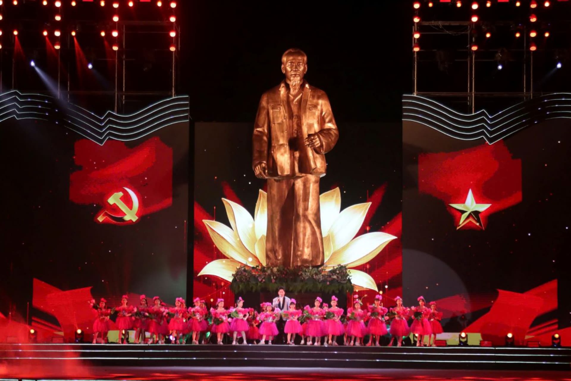 5月15日晚,在南坛县金莲乡莲花村体育场,义安省同公安部、文化体育旅游部联合举行2025年莲花村文化节开幕式暨"胡伯伯归故里"雕像落成仪式,纪念胡志明主席诞辰135周年。