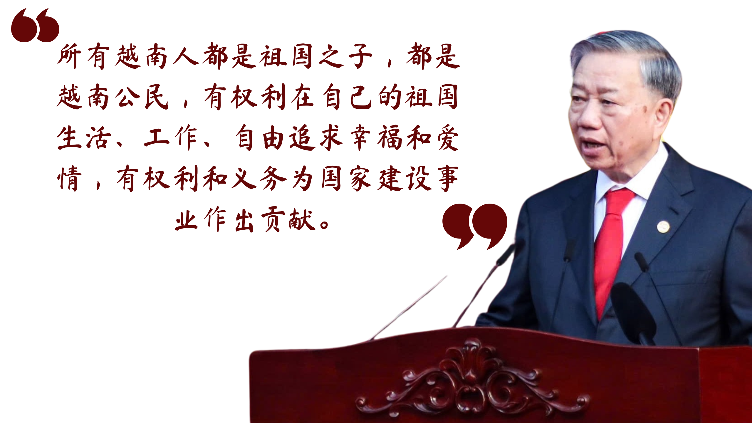 深知人民和民族大团结的无比伟大力量,我们深刻领会并贯彻“以民为本”观点,人是建设、保卫和发展国家的中心、主体和目的。大力推行民族和谐、和解政策,秉持“同根同源、同祖同宗”精神。所有越南人都是祖国之子,都是越南公民,有权利在自己的祖国生活、工作、自由追求幸福和爱情,有权利和义务为国家建设事业作出贡献。