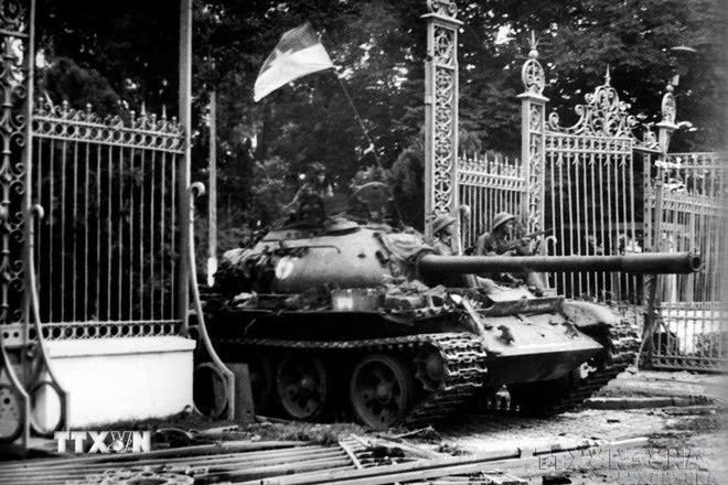 1975年4月30日中午,解放军坦克攻占独立宫,标志着抗美战争结束,南方彻底解放,国家统一。(越通社战地记者陈梅响 摄)