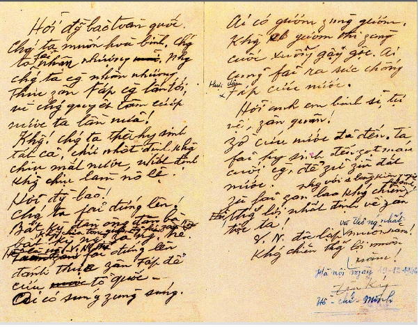 Lời kêu gọi Toàn quốc kháng chiến của Chủ tịch Hồ Chí Minh. Ảnh: Bảo tàng lịch sử quốc gia