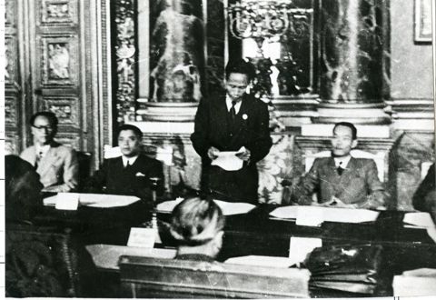 Ông Phạm Văn Đồng, Trưởng đoàn Chính phủ nước Việt Nam Dân chủ Cộng hòa đọc diễn văn khai mạc tại Hội nghị Phôngtennơblô, 6/7/1946 (từ trái qua phải các ông: Hoàng Minh Giám, Phan Anh, Phạm Văn Đồng, Dương Bạch Mai). Ảnh: Bảo tàng lịch sử quốc gia