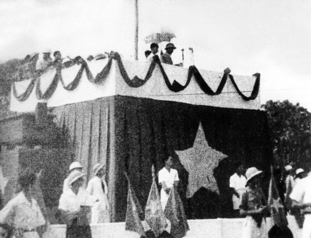 Le matin du 2 septembre 1945, sur la place historique de Ba Dinh, le Président Hô Chi Minh donne lecture à la Déclaration d’indépendance, proclamant la naissance de la République démocratique du Vietnam. Photo : VNA.
