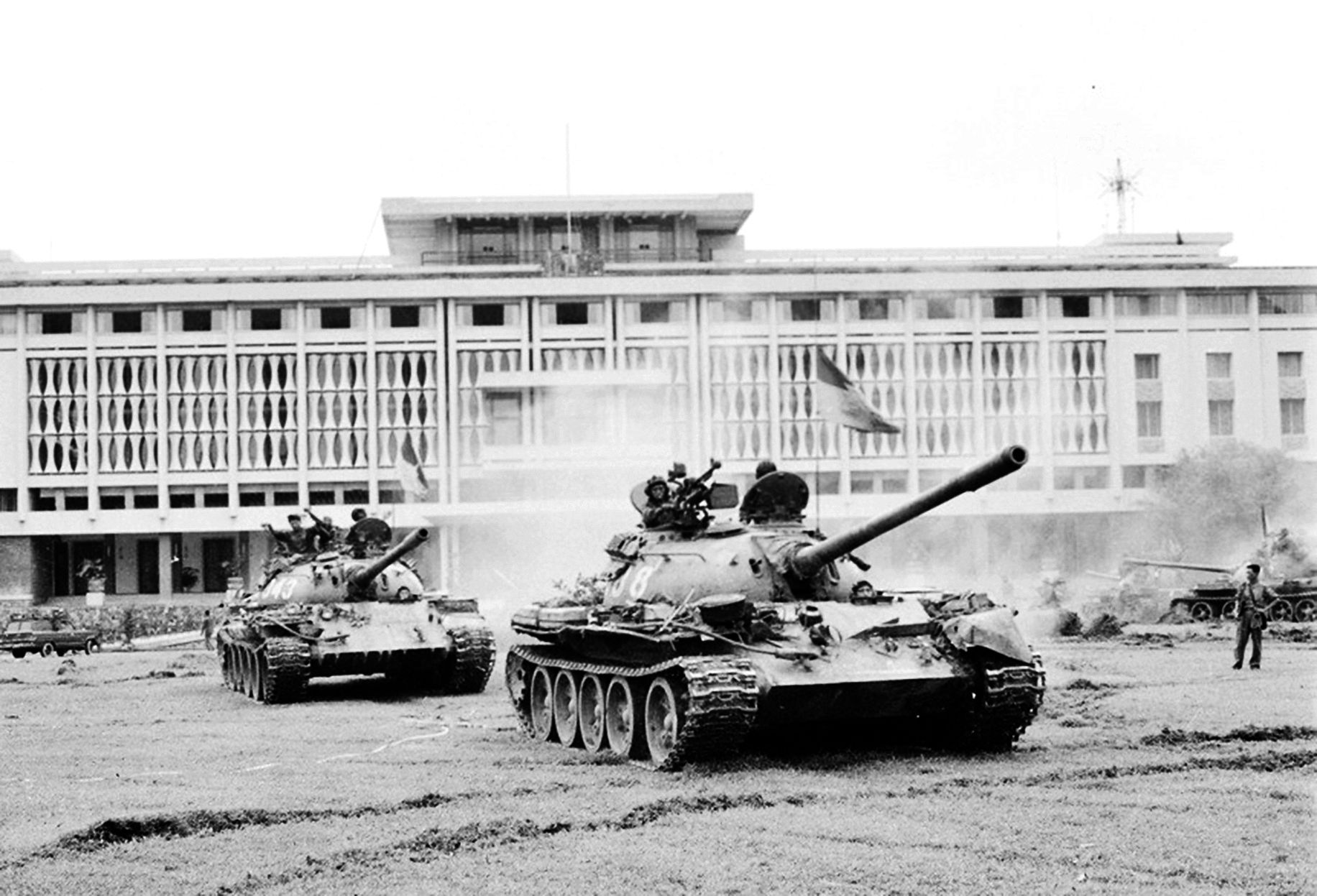 Sáng 30/4/1975, từ khắp mọi hướng, hàng trăm xe tăng, xe thiết giáp cùng bộ binh đồng loạt thẳng tiếnPhủ Tổng thống ngụy quyền Sài Gòn, giải phóng Sài Gòn. Ảnh: MAI HƯỞNG