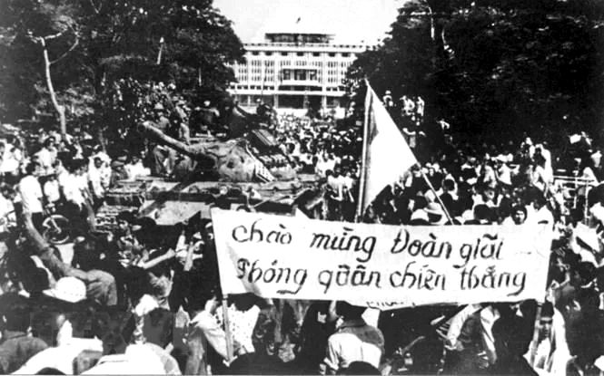 Nhân dân Sài Gòn đổ ra đường đón chào quân giải phóng chiếm phủ Tổng thống ngụy, trưa 30-4-1975. Ảnh Tư liệu (TTXVN)