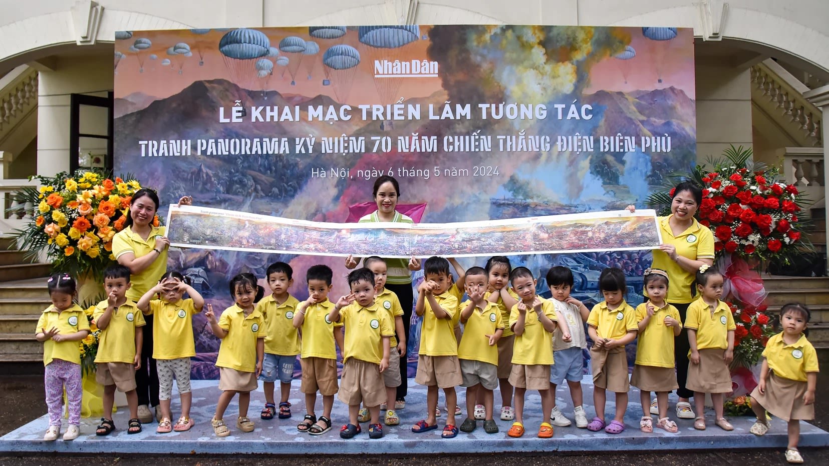 Các đại biểu và các em thiếu nhi tại lễ ra mắt triển lãm Những trận đánh nổi tiếng, những vị tướng tài danh tại trụ sở Báo Nhân Dân.