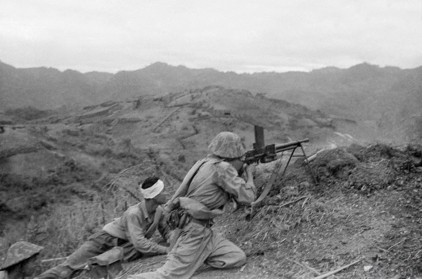 Sau khi pháo binh ngừng bắn, các chiến sĩ xung kích của ta đã lợi dụng địa hình địa vật đang tiến sát vào các vị trí của địch trên đồi Him Lam, và tiêu diệt các vị trí của địch ở đây ngay trong ngày 13/3/1954, ngày mở đầu chiến dịch. (Ảnh: TTXVN)