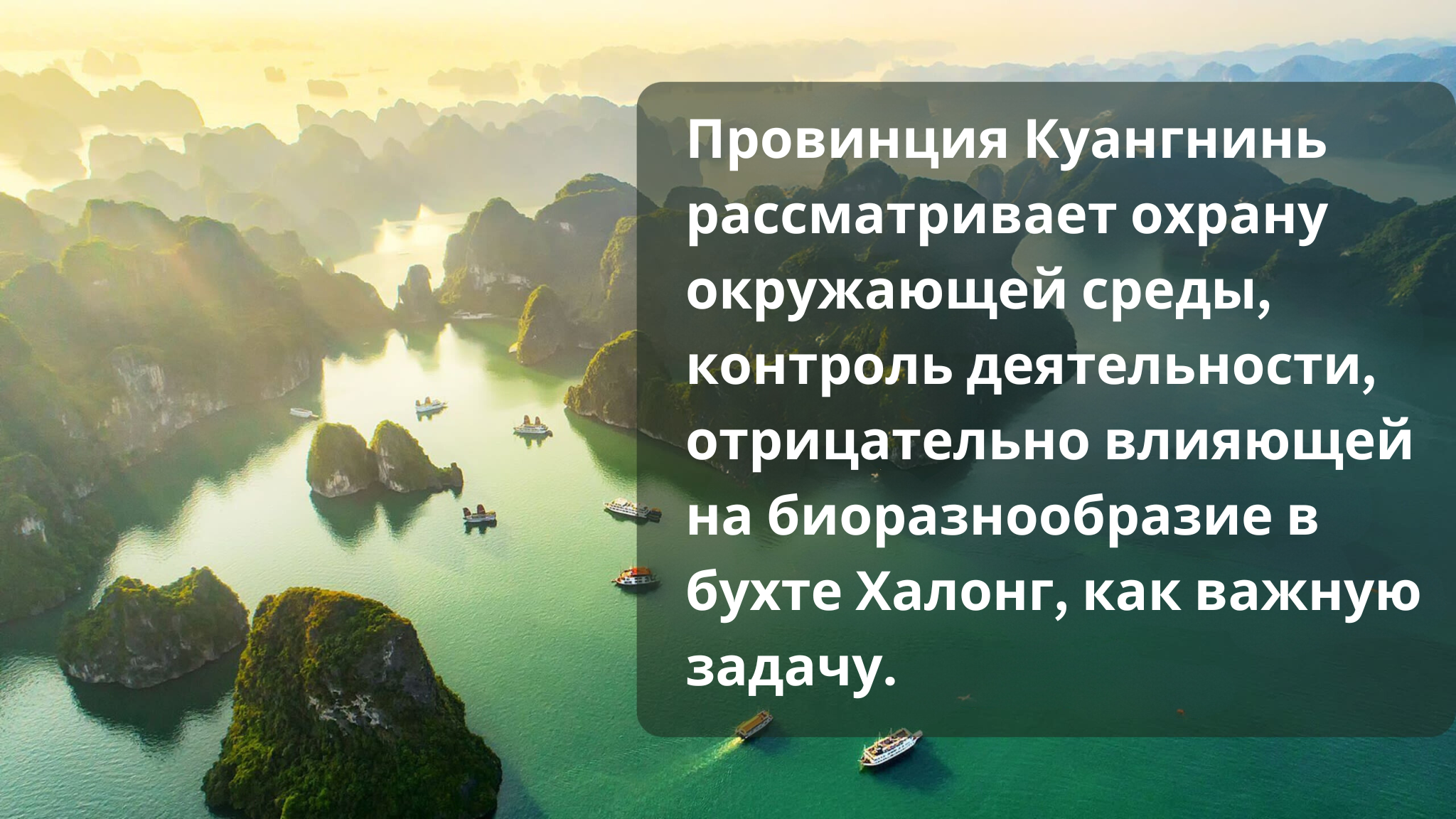 Провинция Куангнинь рассматривает охрану окружающей среды, контроль деятельности, отрицательно влияющей на биоразнообразие в бухте Халонг, как важную задачу. Поэтому местные власти развернули патрулирование, контроль и строго наказывает за действия, причиняющие вред экосистеме и видам. Отдел управления бухтой Халонг активно призвал международные организации оказывать поддержку ему в реализации решений по сохранению биоразнообразия в бухте Халонг, таких как координация действий с ЮНЕСКО и Международным союзом охраны природы (МСОП) для реализации программы надзора за биоразнообразием бухты Халонг в 2019 году, установил сотрудничество с Осакским университетом (Япония) в развертывании мероприятий по восстановлению мангровой экосистемы в районах Дауго и Бакыа в бухте Халонг...