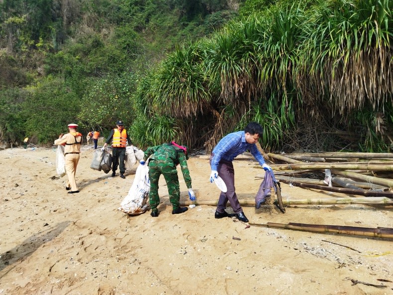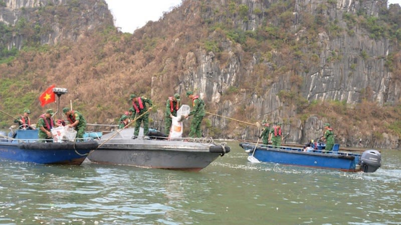 Пограничники Куангниня участвуют в уборке мусора в бухте Халонг.