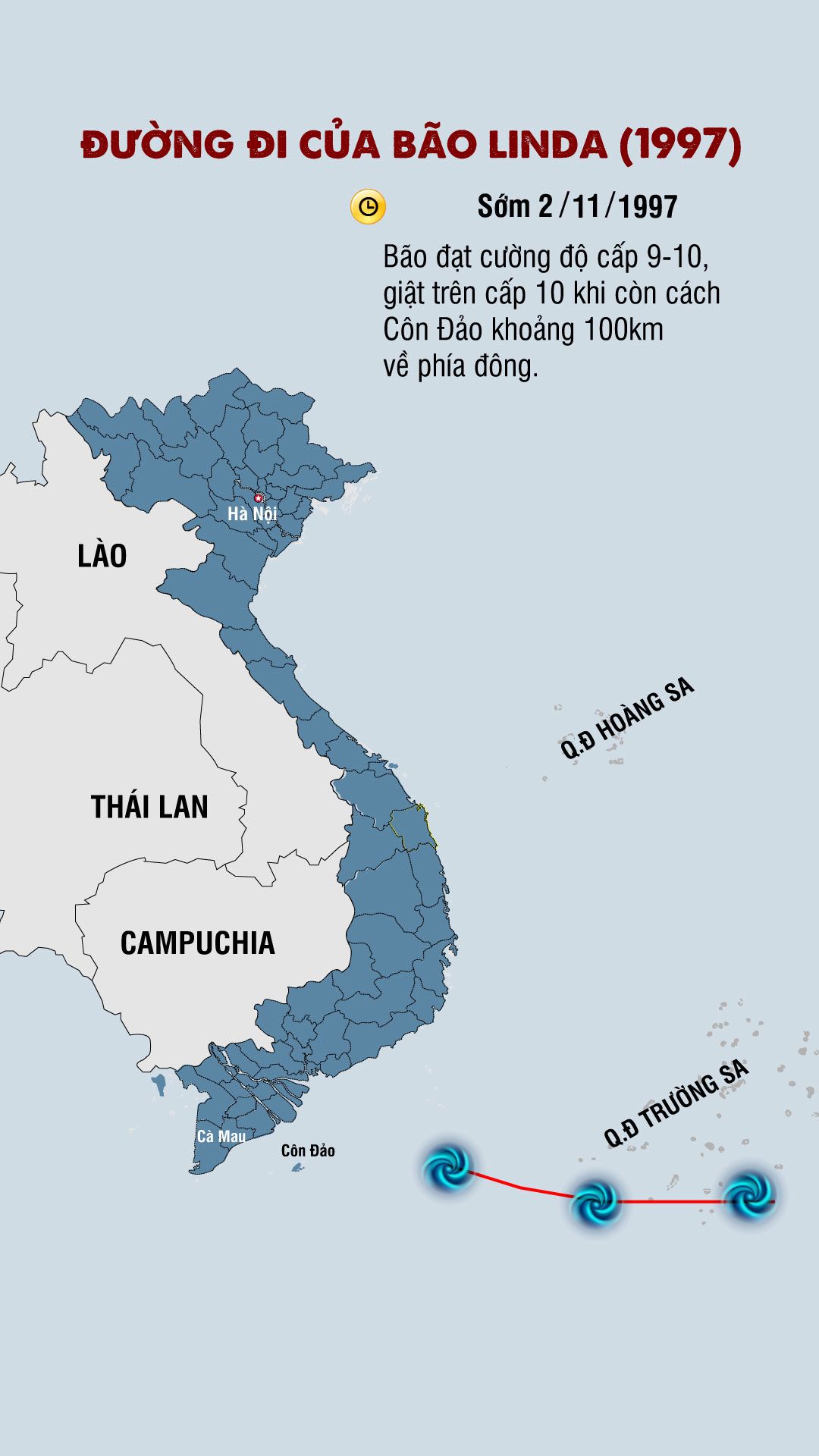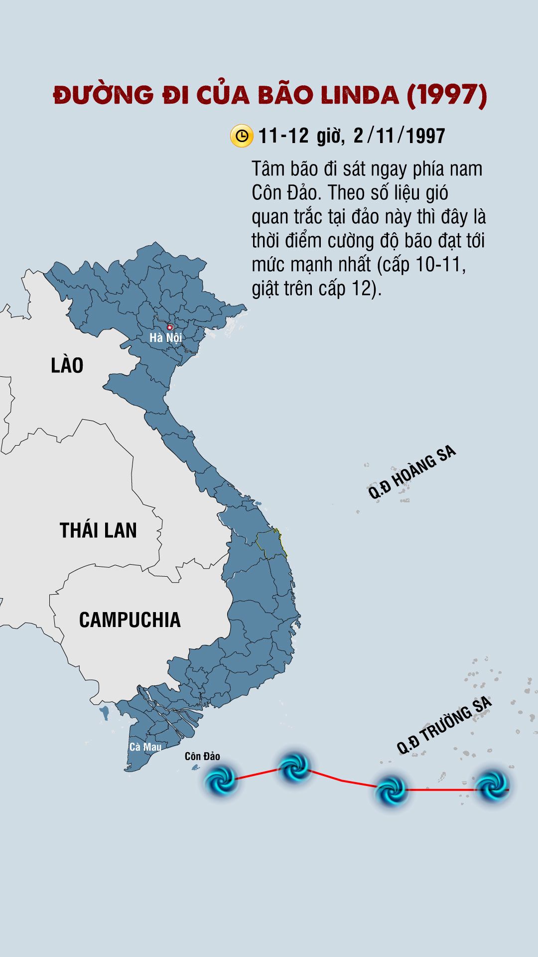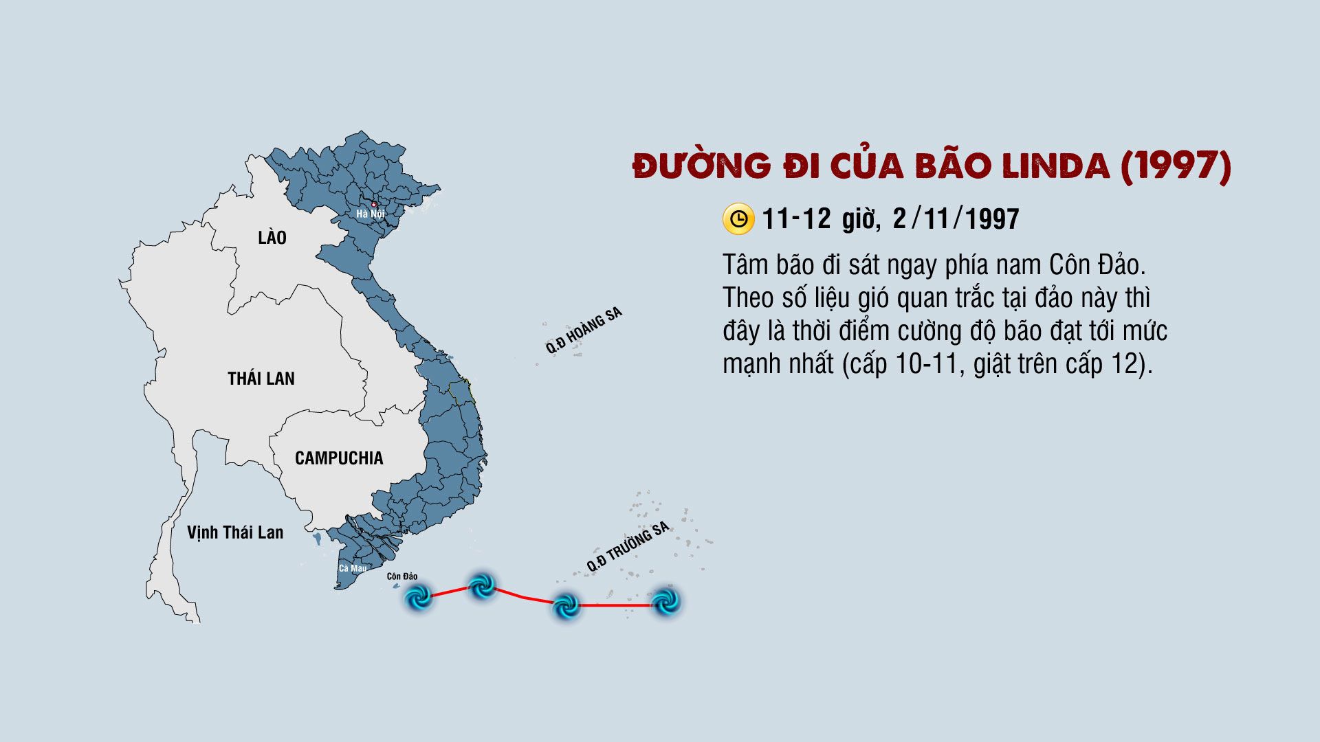 Sáng sớm 2/11/1997, bão đạt cường độ cấp 9-10, giật trên cấp 10 khi còn cách Côn Đảo khoảng 100km về phía đông. Khoảng 11-12 giờ trưa cùng ngày, trung tâm bão đã đi sát ngay phía nam Côn Đảo. Theo số liệu gió quan trắc tại đảo, khi đó bão Linda đã đạt cường độ mạnh nhất (cấp 10-11, giật trên cấp 12).