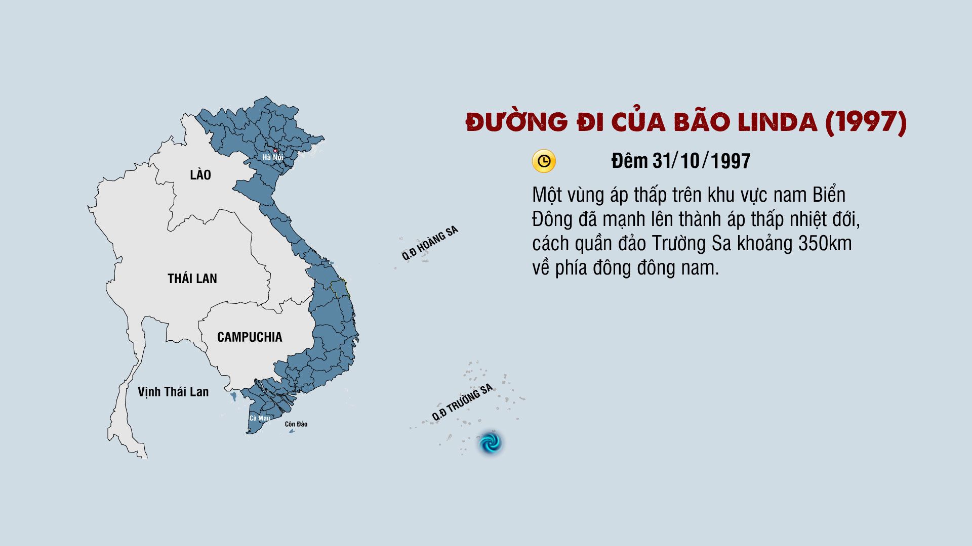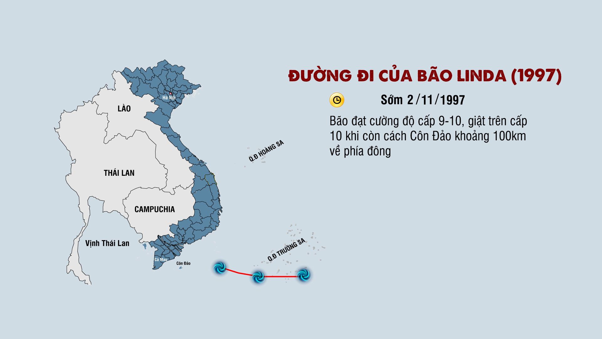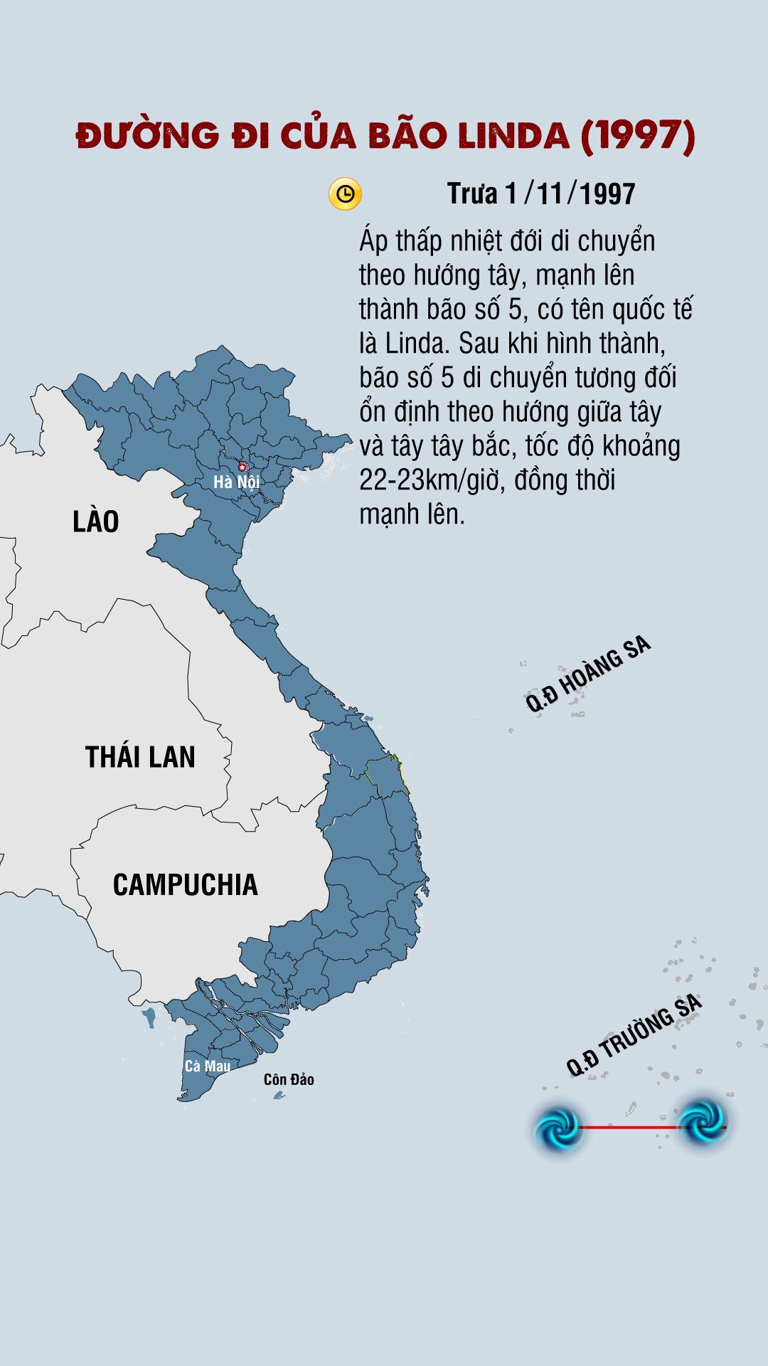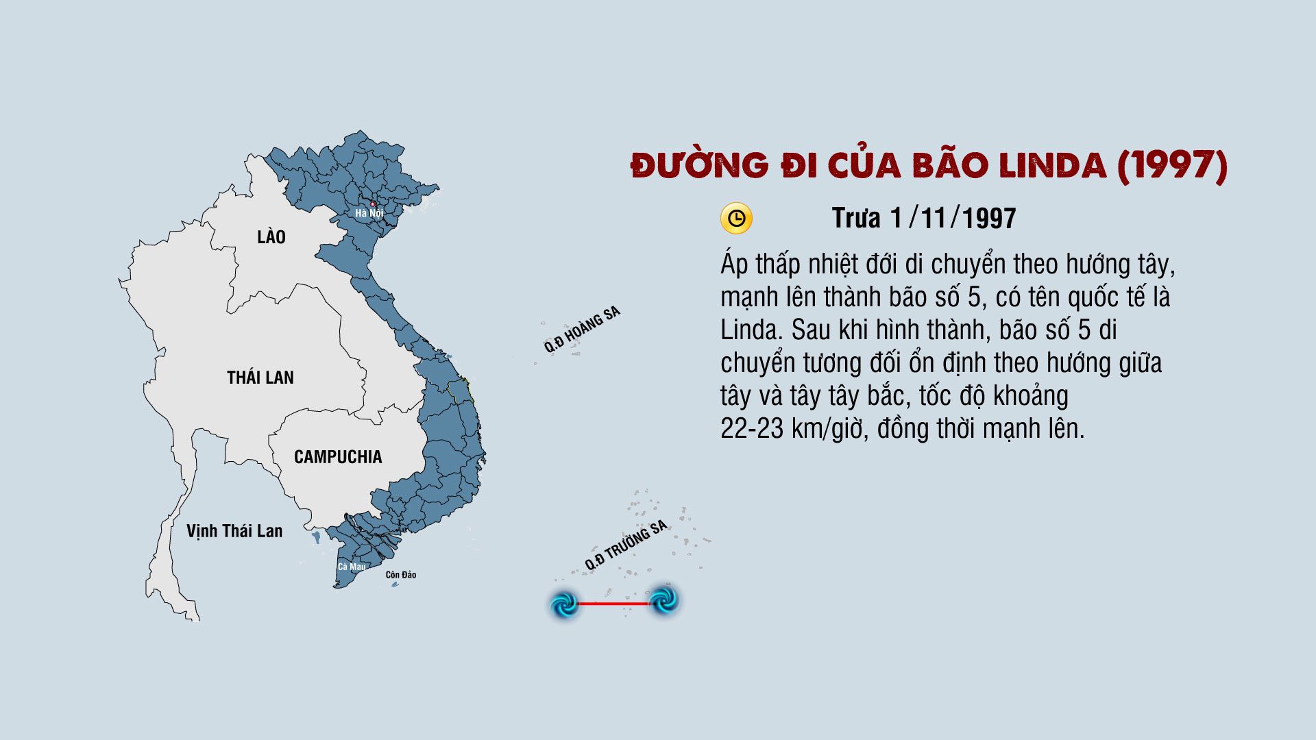 Cơ quan khí tượng thủy văn nhận định, bão Linda là cơn bão có tốc độ di chuyển khá nhanh, khoảng trên 20km/h. Từ khi bão hình thành đến lúc đổ bộ vào đất liền chỉ trong vòng 30 giờ.