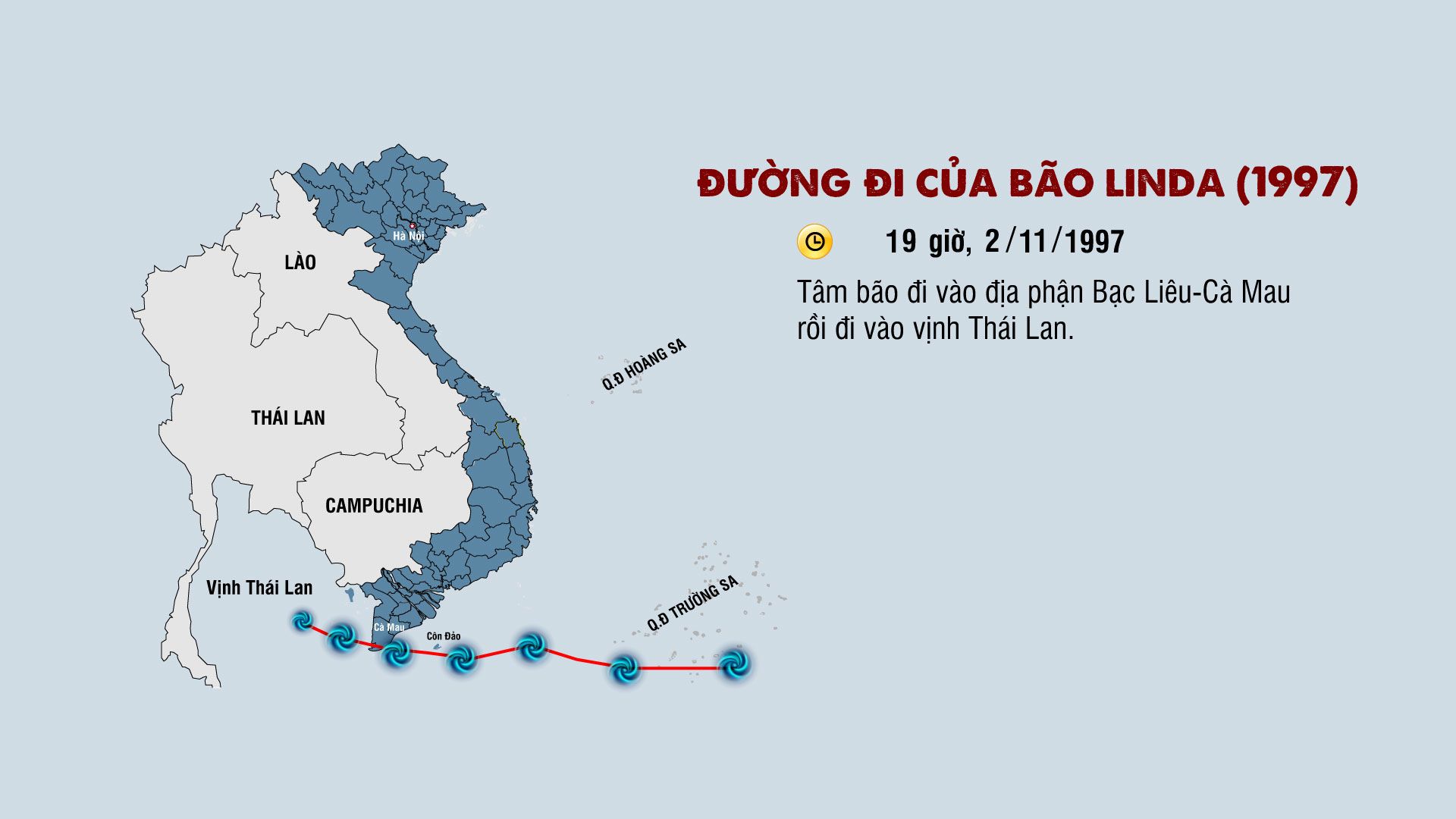 Khoảng 19 giờ tối 2/11/1997, tâm bão đi vào địa phận Bạc Liêu – Cà Mau rồi đi vào vịnh Thái Lan.
