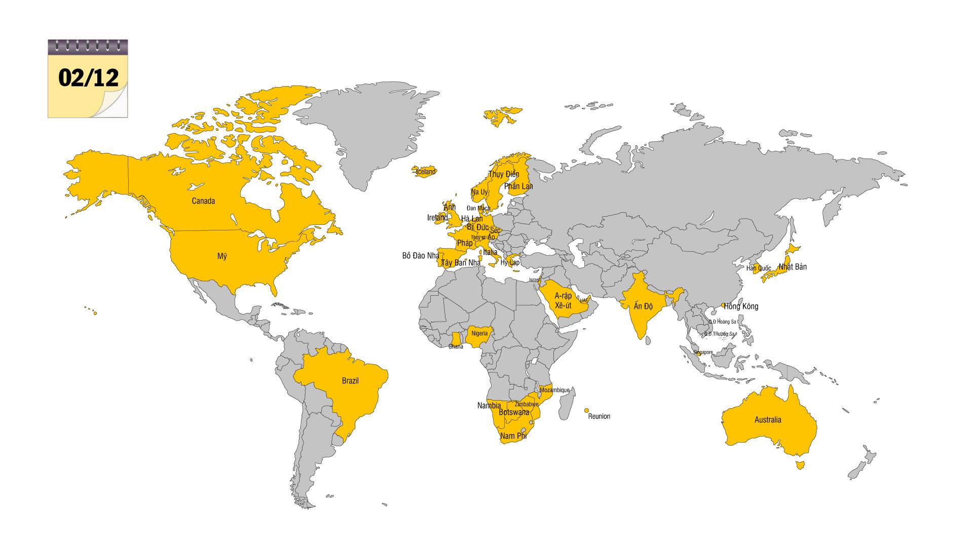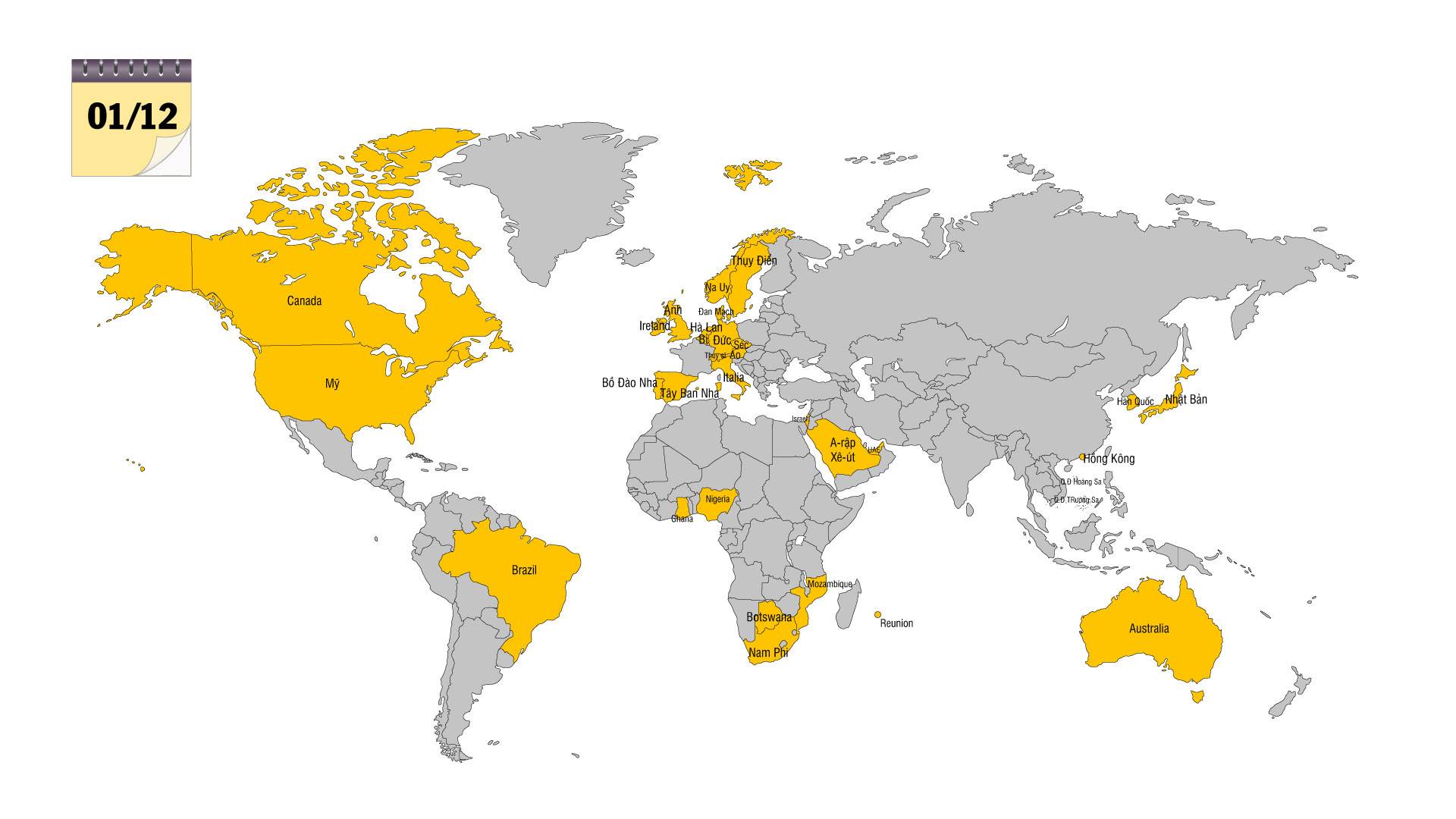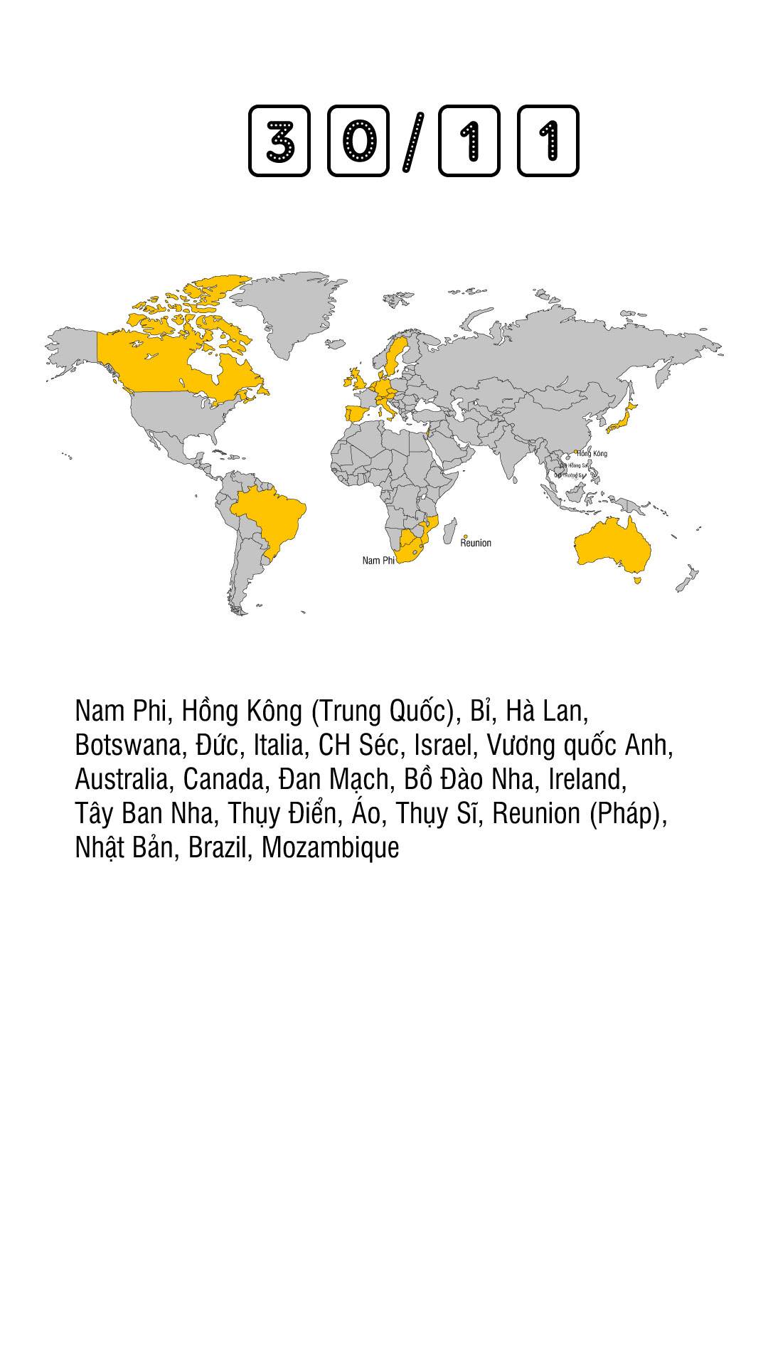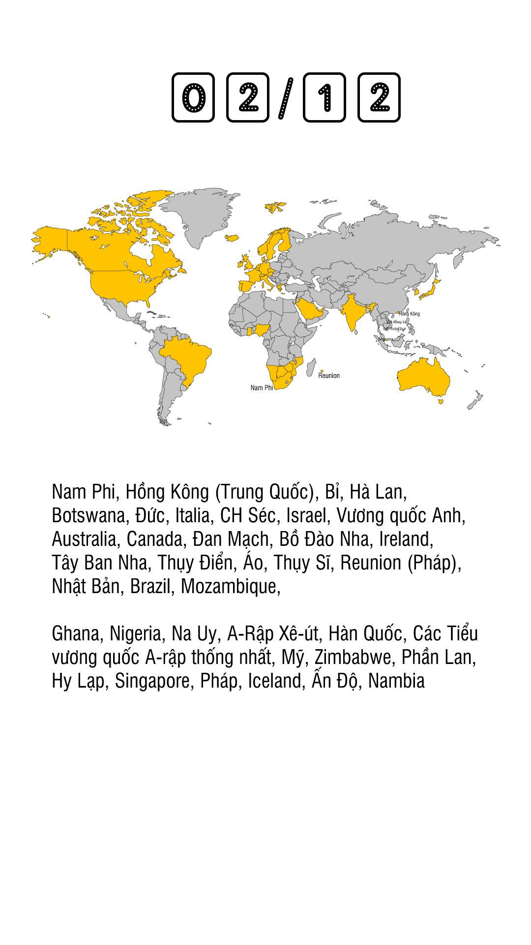 Cụ thể, các quốc gia và vùng lãnh thổ ghi nhận các ca mắc biến thể Omicron gồm: Nam Phi, Hồng Kông (Trung Quốc), Bỉ, Hà Lan, Botswana, Đức, Italia, CH Séc, Israel, Vương quốc Anh, Australia, Canada, Đan Mạch, Bồ Đào Nha, Ireland, Tây Ban Nha, Thụy Điển, Áo, Thụy Sĩ, Reunion (Pháp), Nhật Bản, Brazil, Mozambique,
