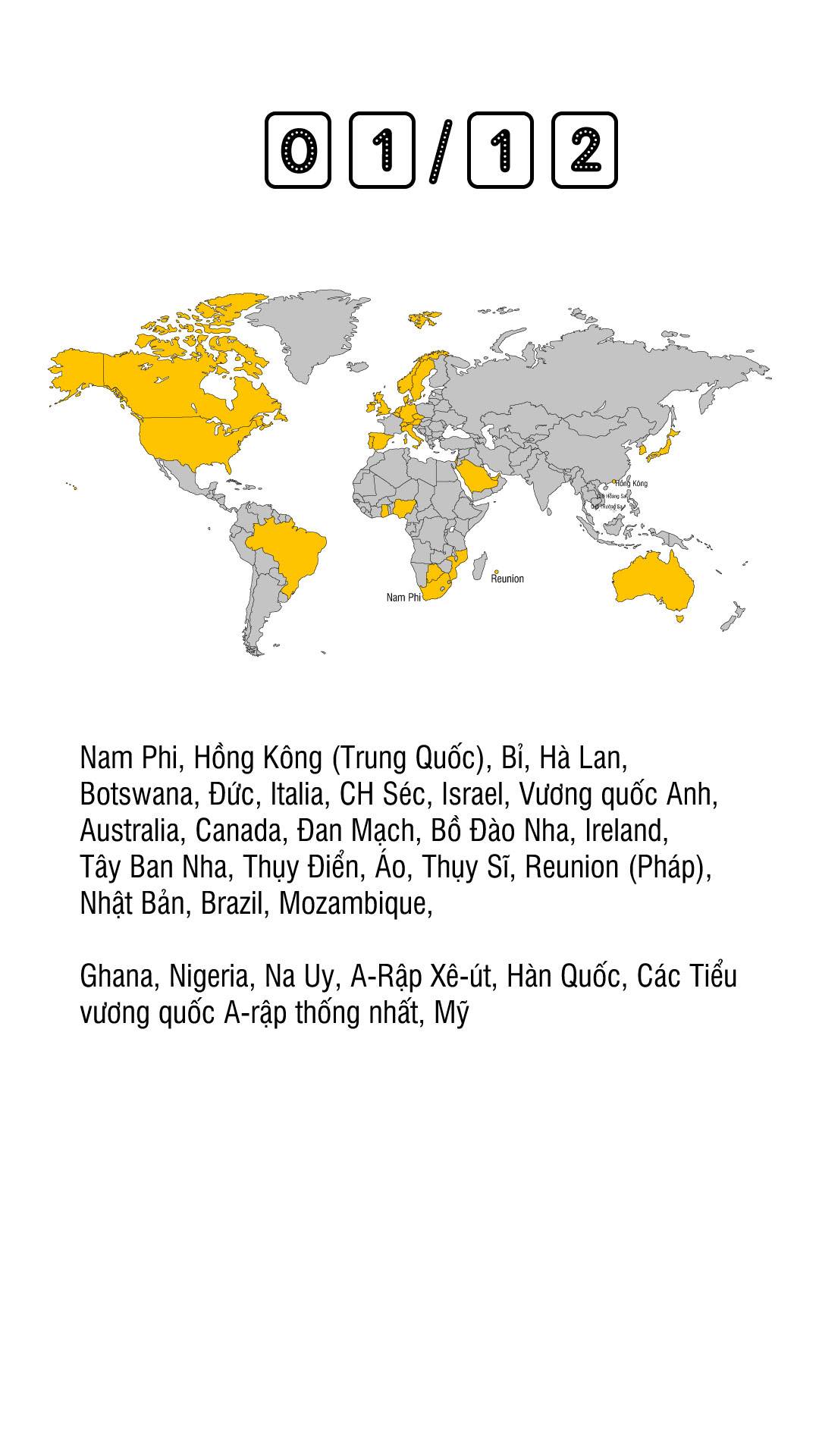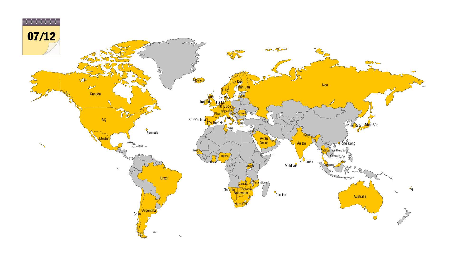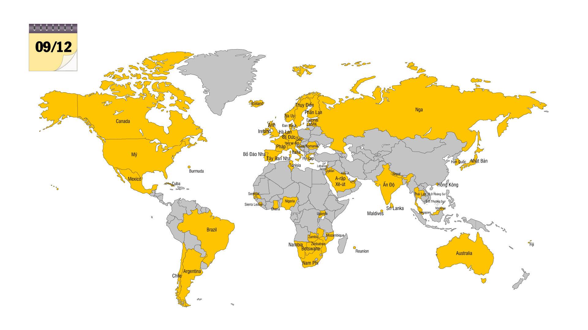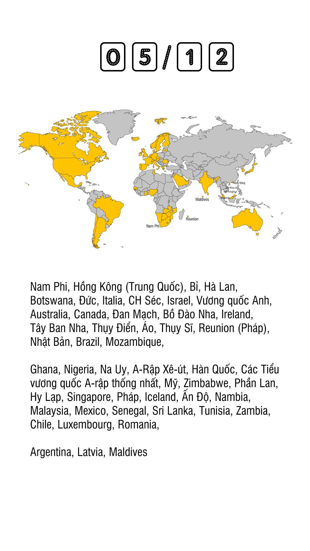 Cụ thể, các quốc gia và vùng lãnh thổ ghi nhận các ca mắc biến thể Omicron gồm: Nam Phi, Hồng Kông (Trung Quốc), Bỉ, Hà Lan, Botswana, Đức, Italia, CH Séc, Israel, Vương quốc Anh, Australia, Canada, Đan Mạch, Bồ Đào Nha, Ireland, Tây Ban Nha, Thụy Điển, Áo, Thụy Sĩ, Reunion (Pháp), Nhật Bản, Brazil, Mozambique,