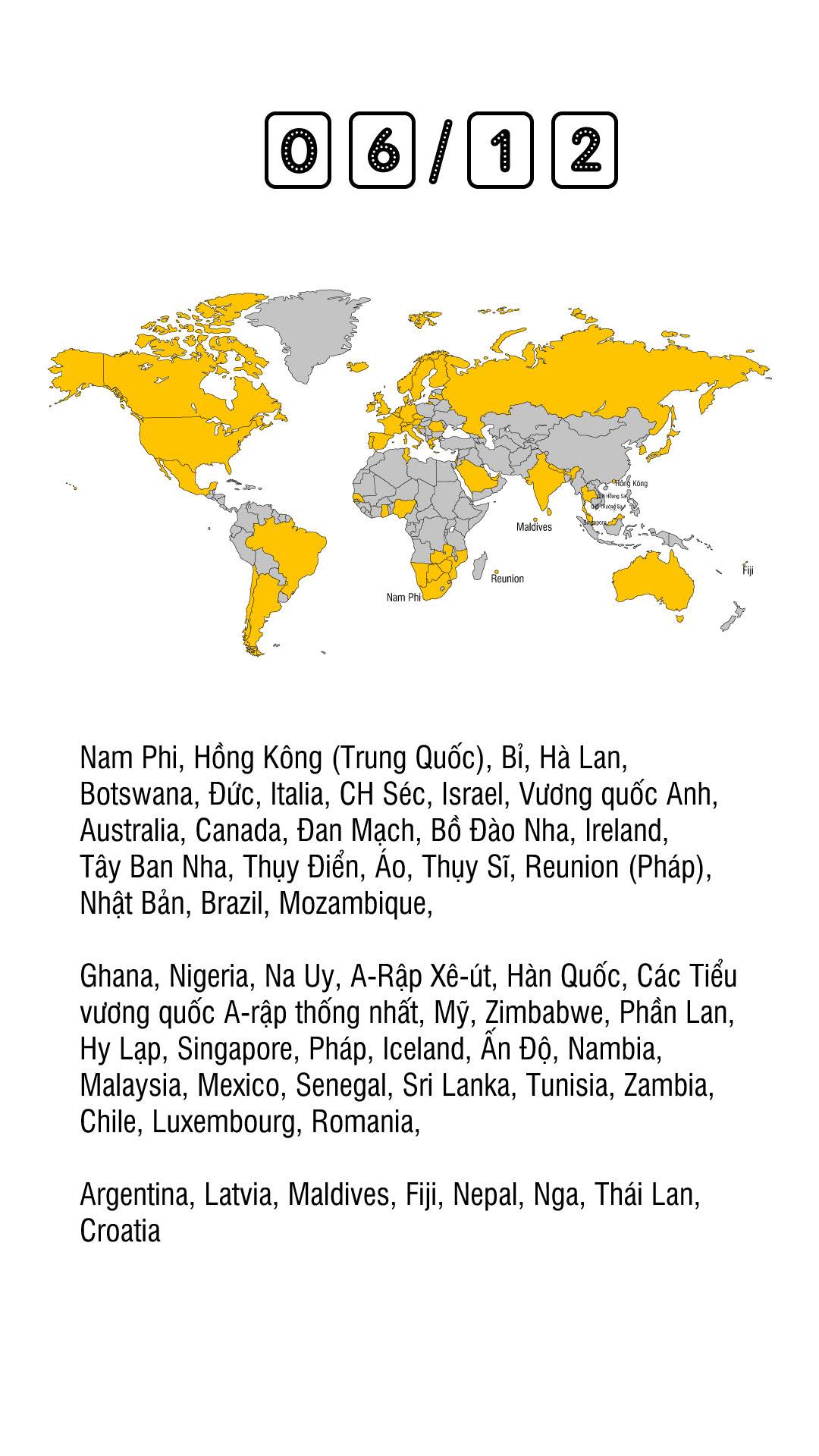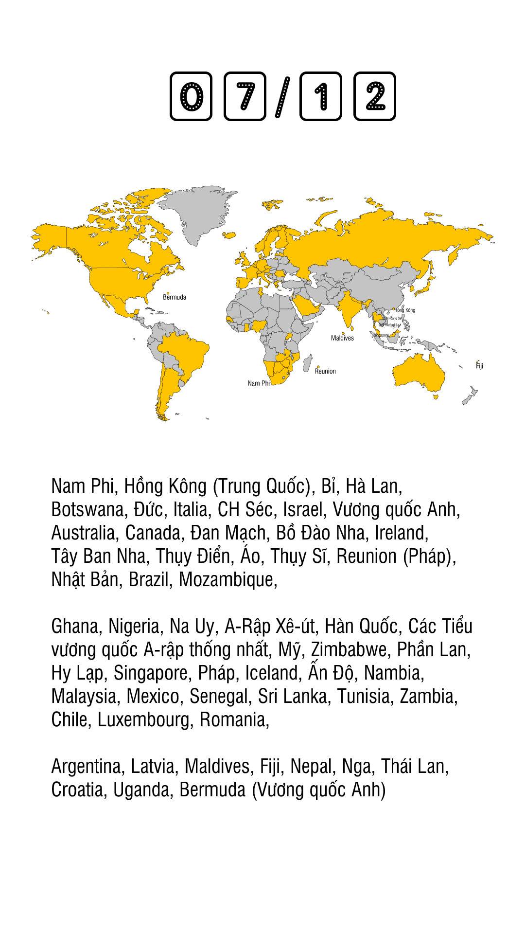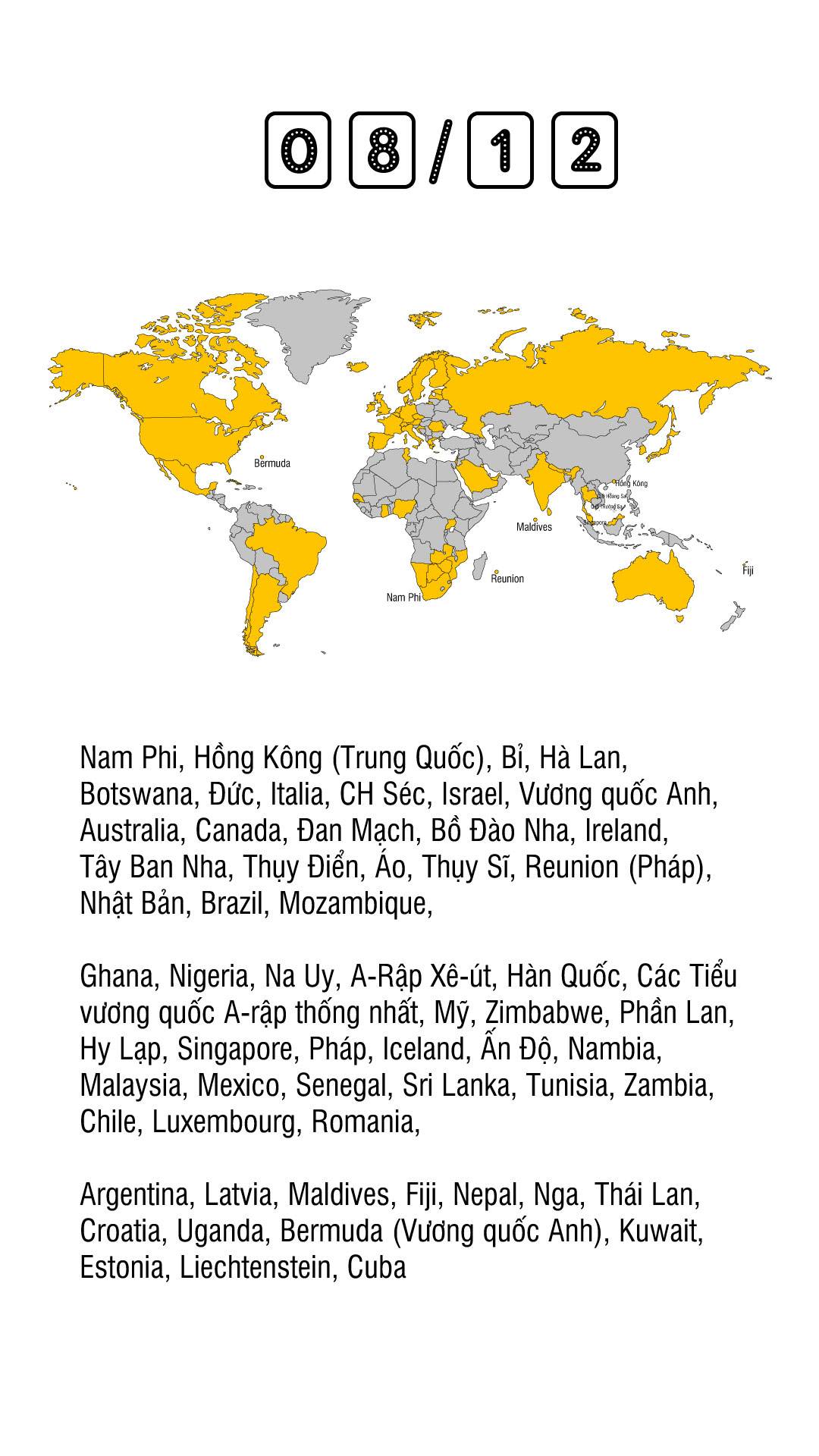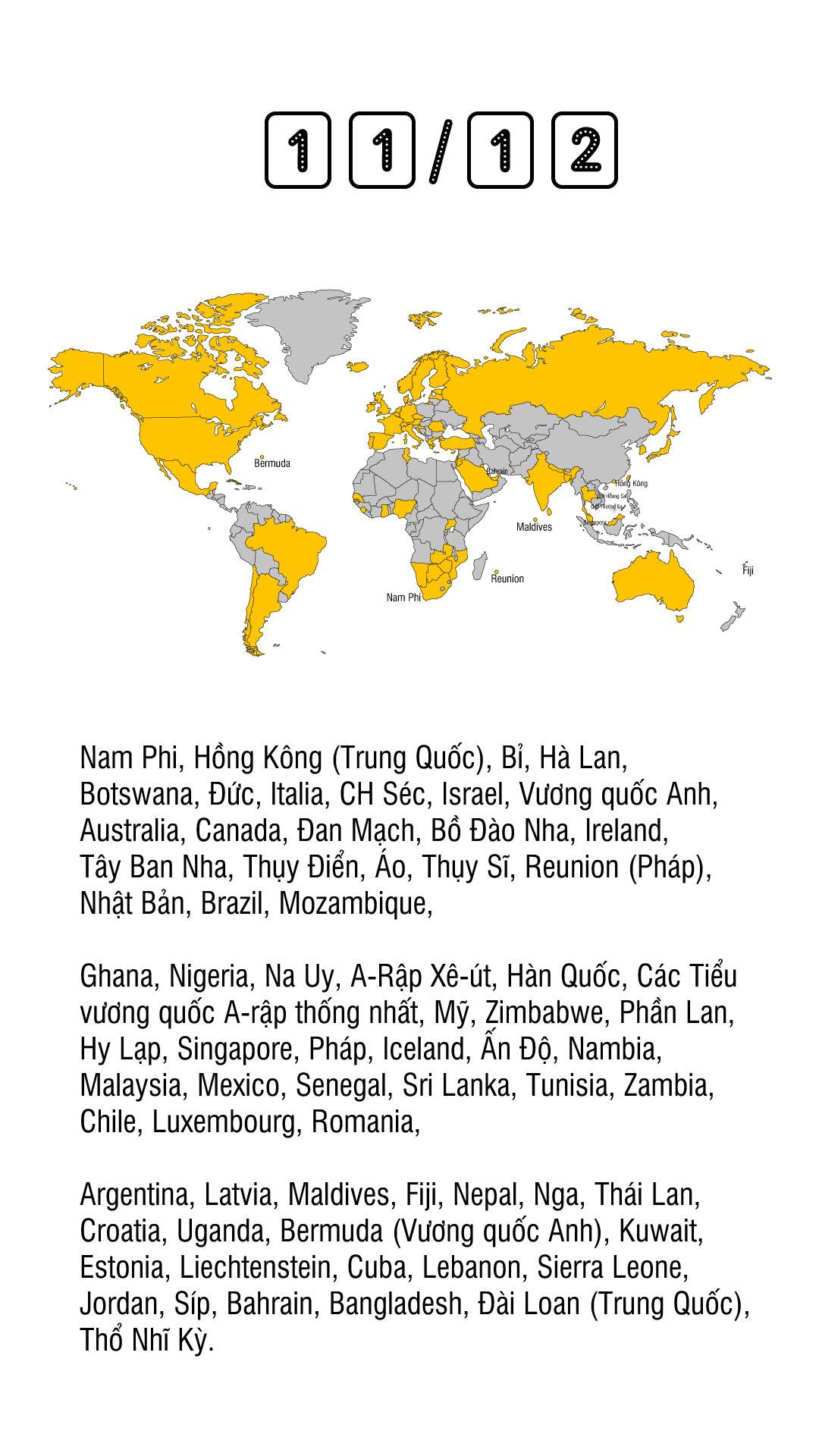 Argentina, Latvia, Maldives, Fiji, Nepal, Nga, Thái Lan, Croatia, Uganda, Bermuda (Vương quốc Anh), Kuwait, Estonia, Liechtenstein, Cuba, Lebanon, Sierra Leone, Jordan, Síp, Bahrain, Bangladesh, Đài Loan (Trung Quốc), Thổ Nhĩ Kỳ.