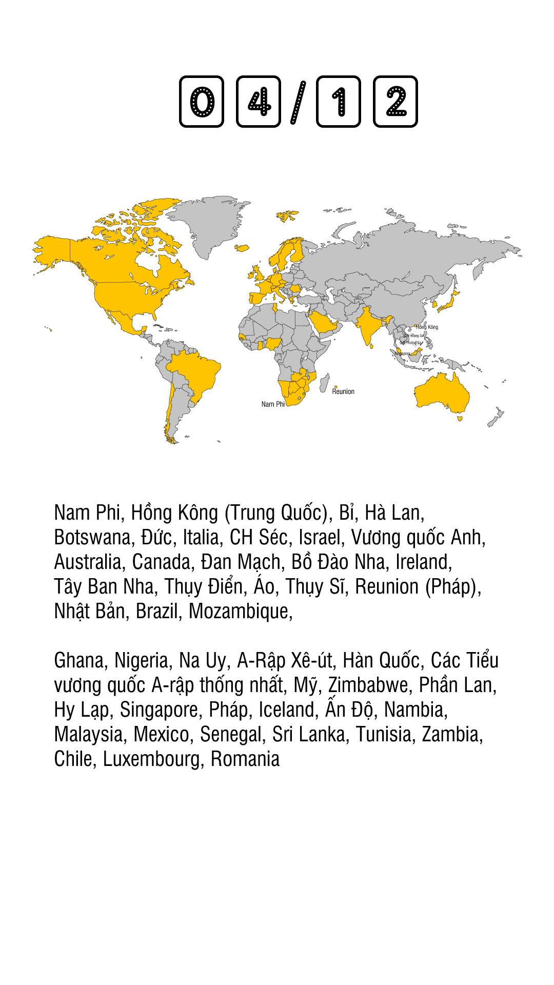Ghana, Nigeria, Na Uy, A-Rập Xê-út, Hàn Quốc, Các Tiểu vương quốc A-rập thống nhất, Mỹ, Zimbabwe, Phần Lan, Hy Lạp, Singapore, Pháp, Iceland, Ấn Độ, Nambia, Malaysia, Mexico, Senegal, Sri Lanka, Tunisia, Zambia, Chile, Luxembourg, Romania,