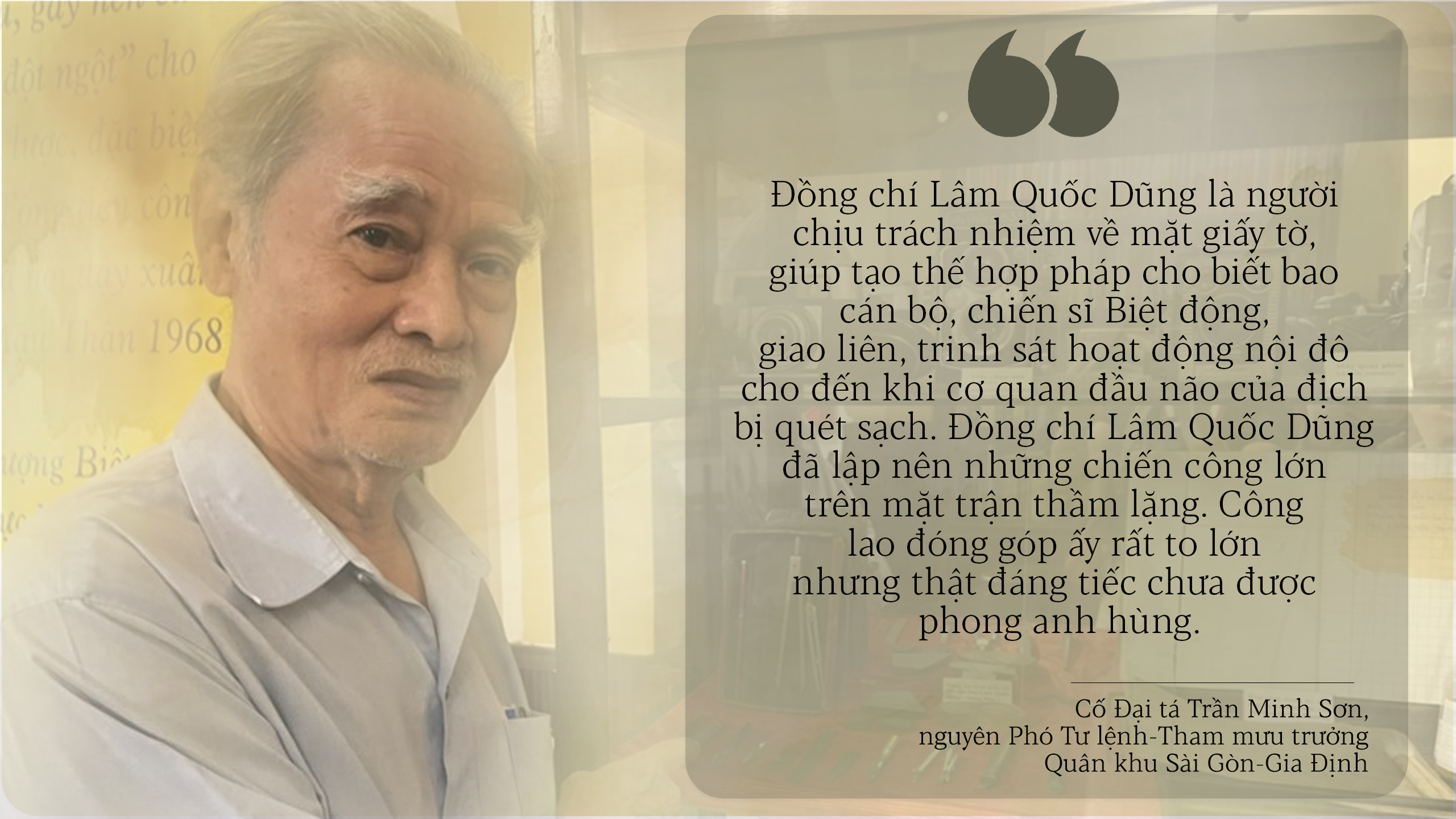 Chín năm chuyên tâm để tạo nên “vũ khí bí mật” là các giấy tờ giả cho các chiến sĩ biệt động Sài Gòn-Gia Định, Lâm Quốc Dũng (bí danh Dũng “râu”) đã trải qua nhiều phen tưởng chừng bế tắc. Nhưng bằng dụng cụ đơn giản như bút viết, thước kẻ, compa…, với đôi mắt tinh anh, bàn tay khéo léo, Dũng “râu” đã mô phỏng được cả những giấy tờ tinh vi nhất của chính quyền Việt Nam Cộng hòa, tạo “vỏ bọc” hoàn hảo cho lực lượng biệt động hoạt động trong nội đô. Thời ấy, mọi người gọi các giấy tờ giả của Dũng “râu” là “tấm bùa hộ mệnh”.