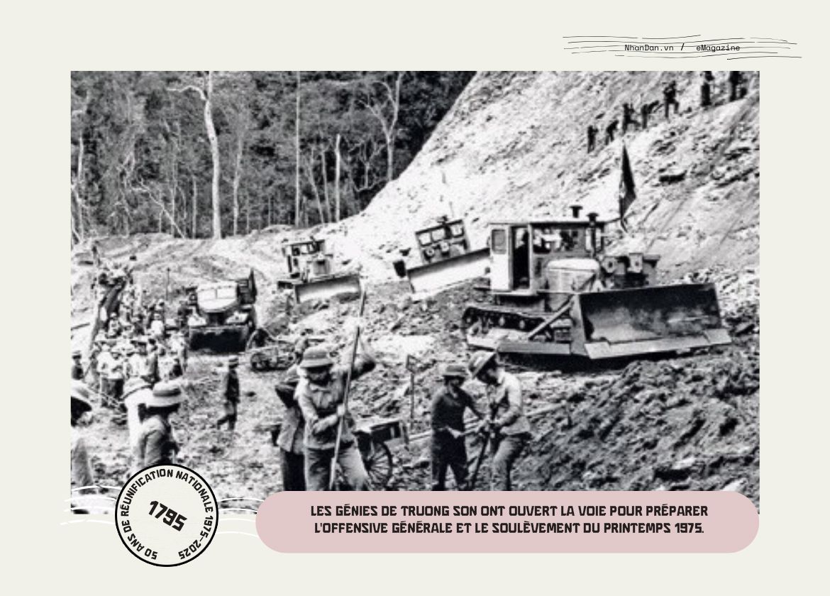 Plus particulièrement, lors de la campagne Ho Chi Minh, les unités du génie de Truong Son ont assuré la circulation sur sept axes routiers totalisant 2 577 km, réparé et construit 89 ponts pour une longueur totale de 4 216 mètres, surmonté des centaines d’obstacles sur les voies de communication, garantissant ainsi la mobilité rapide des forces vers la libération de Saïgon.