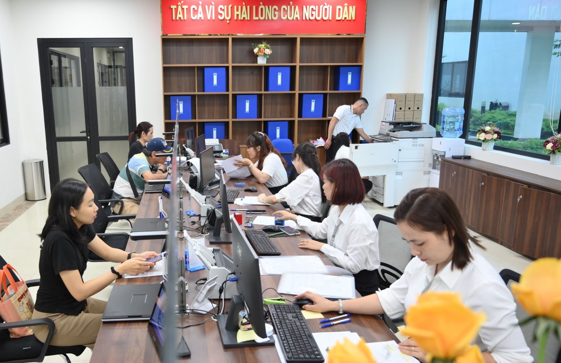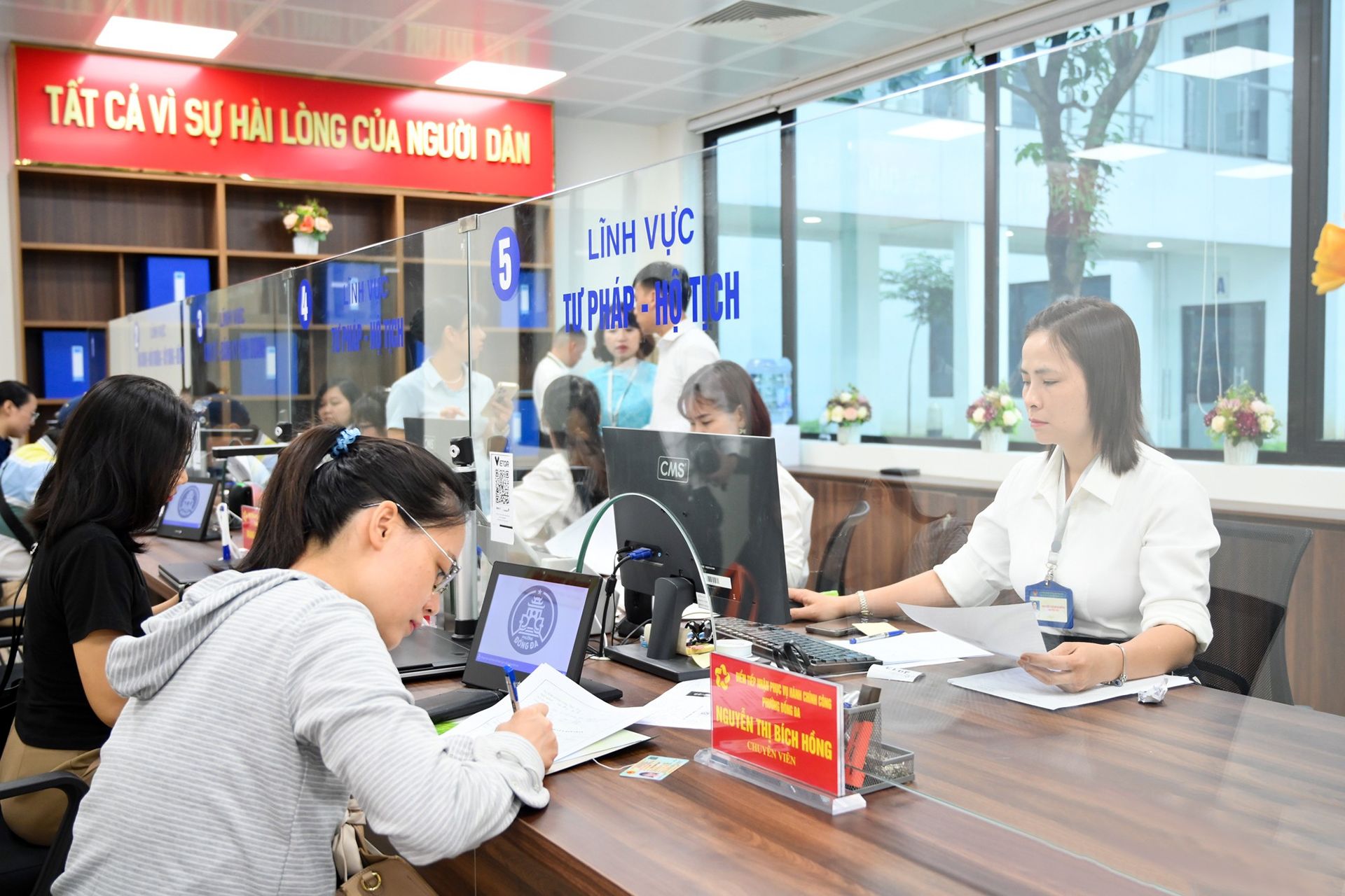 Cán bộ phường Đống Đa tiếp nhận hồ sơ hành chính từ người dân trong ngày đầu vận hành mô hình mới.