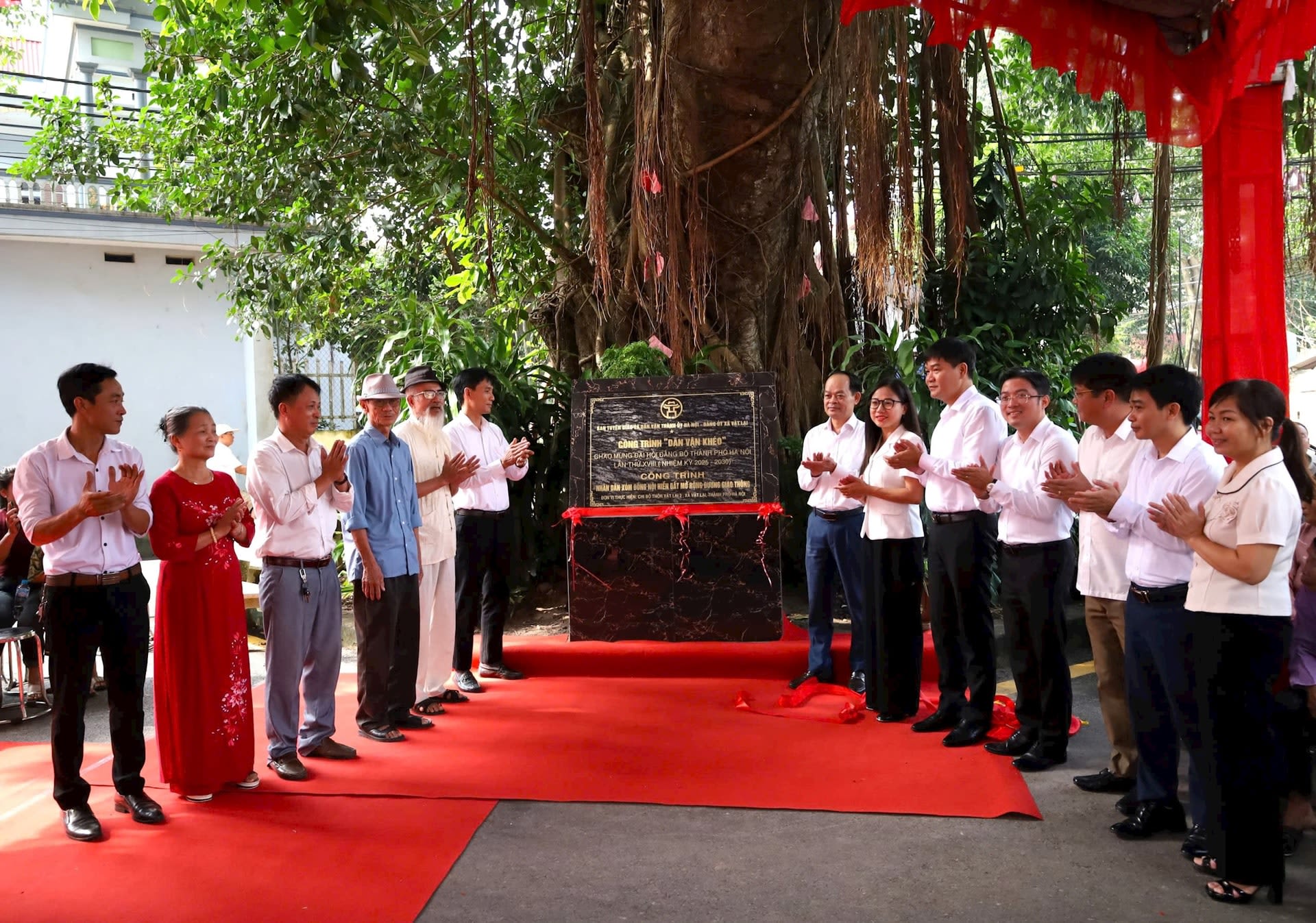 Gắn biển công trình dân vận khéo: “Nhân dân xóm Nội-thôn Vật Lại 2 hiến đất mở rộng đường giao thông” tại xã Vật Lại. (Ảnh: Nguyên Anh)