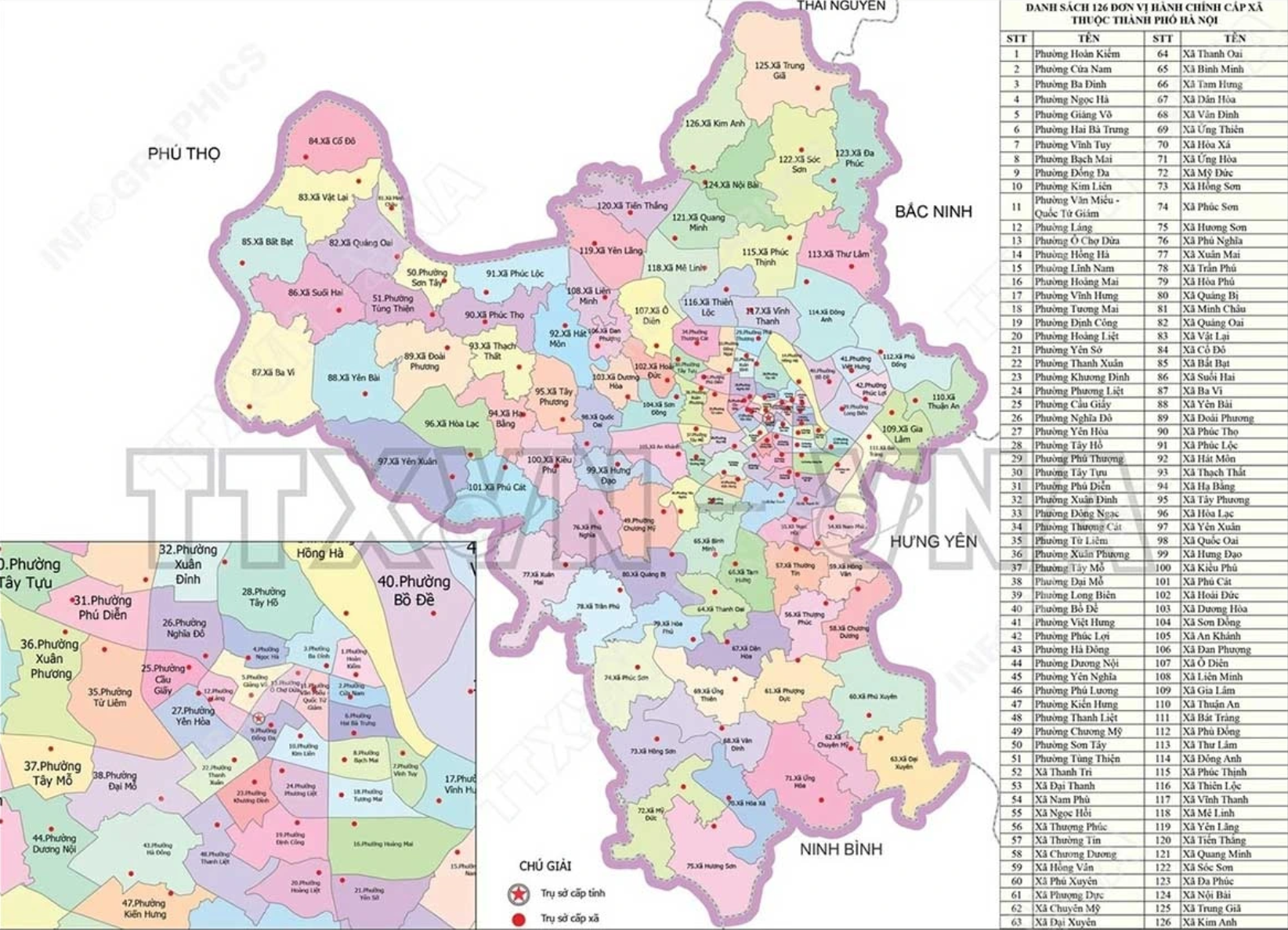 Thành phố Hà Nội có 126 đơn vị hành chính cấp xã, gồm 51 phường và 75 xã. Đồ họa: TTXVN