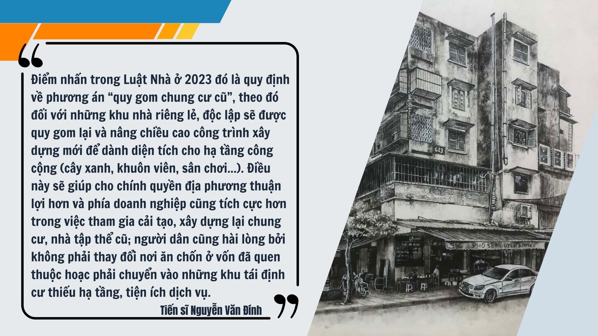 Tiến sĩ Nguyễn Văn Đính cũng đánh giá: Điểm nhấn trong Luật Nhà ở 2023 đó là quy định về phương án “quy gom chung cư cũ”, theo đó đối với những khu nhà riêng lẻ, độc lập sẽ được quy gom lại và nâng chiều cao công trình xây dựng mới để dành diện tích cho hạ tầng công cộng (cây xanh, khuôn viên, sân chơi...). Điều này sẽ giúp cho chính quyền địa phương thuận lợi hơn và phía doanh nghiệp cũng tích cực hơn trong việc tham gia cải tạo, xây dựng lại chung cư, nhà tập thể cũ; người dân cũng hài lòng bởi không phải thay đổi nơi ăn chốn ở vốn đã quen thuộc hoặc phải chuyển vào những khu tái định cư thiếu hạ tầng, tiện ích dịch vụ.