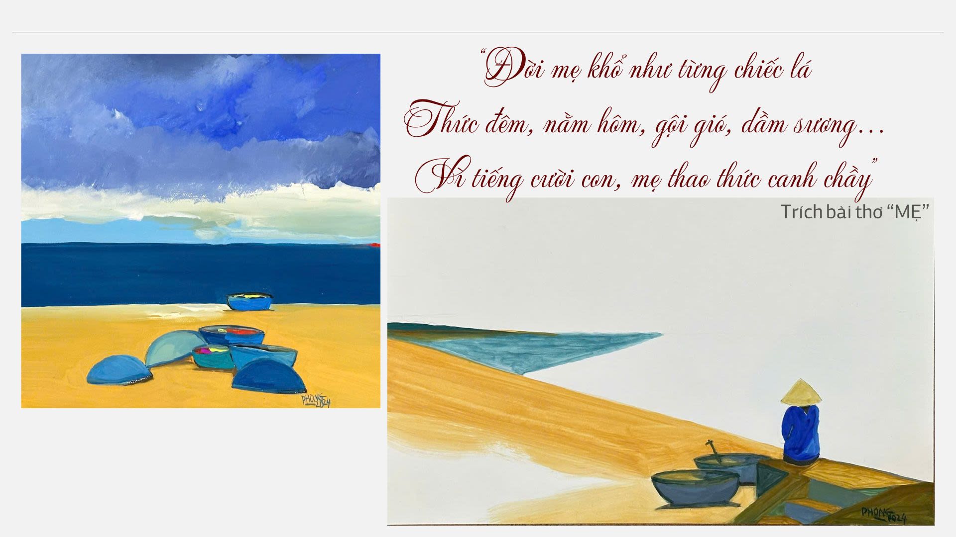 Khắc cốt ghi tâm phụ tử tình thâm, ông coi tình thương ấy như sóng biển vỗ mãi dưới thuyền cha: “Đời cha gắn với con thuyền trên biển/ Với nhọc nhằn, bão tố, phong ba/ Con đi xa không đỡ đần cha được/ Chỉ nhớ thương Người qua những dòng thư.../ Lòng con dào dạt sóng/ Con sóng tình thương vỗ mãi dưới thuyền cha” (Thương cha).