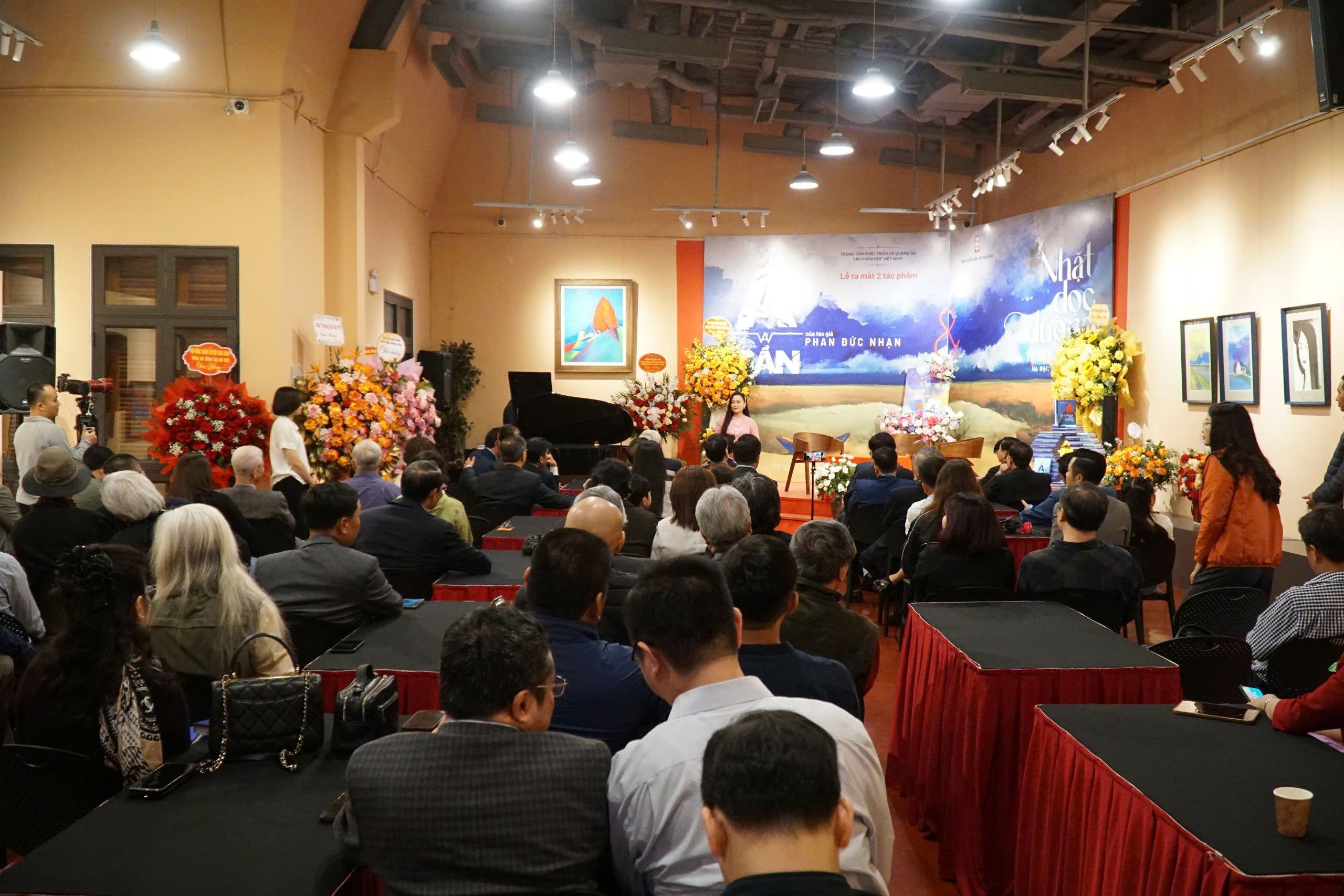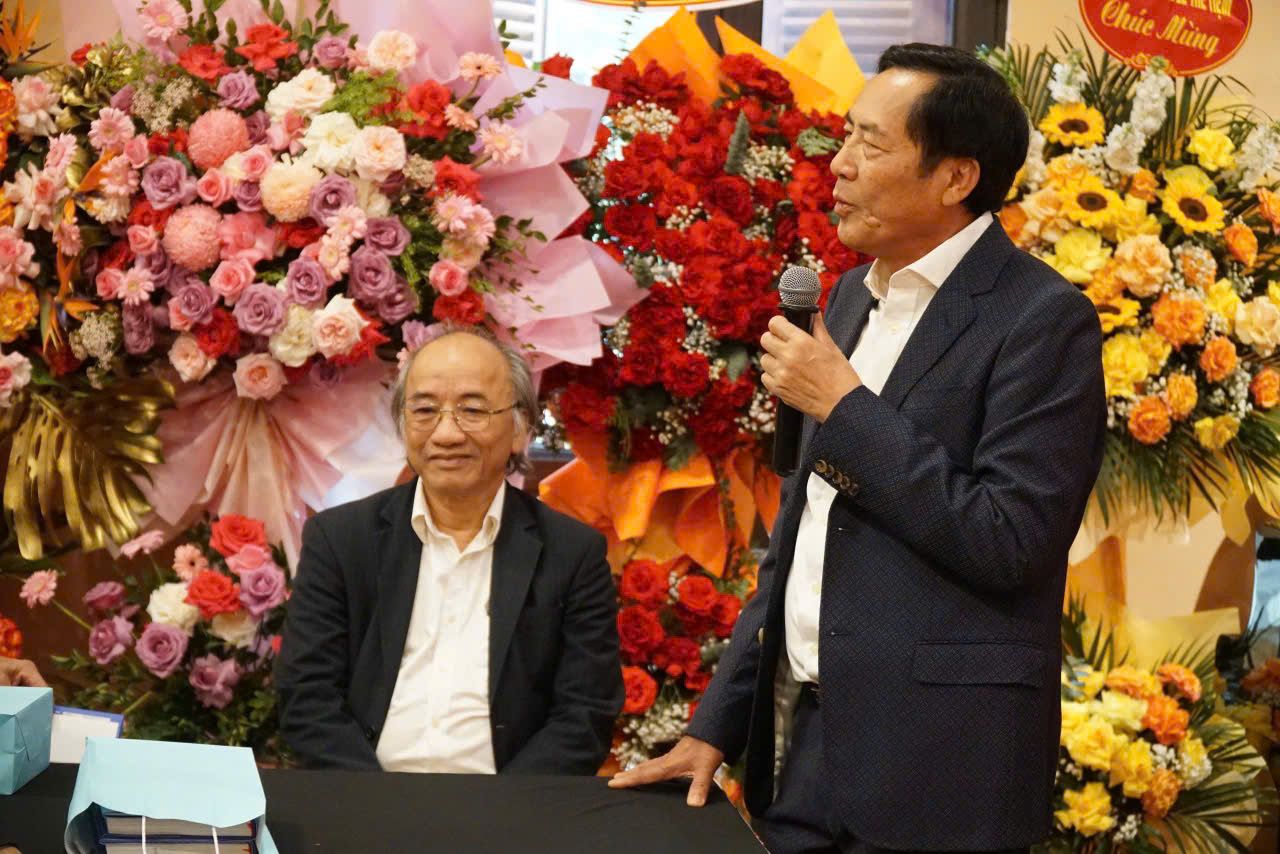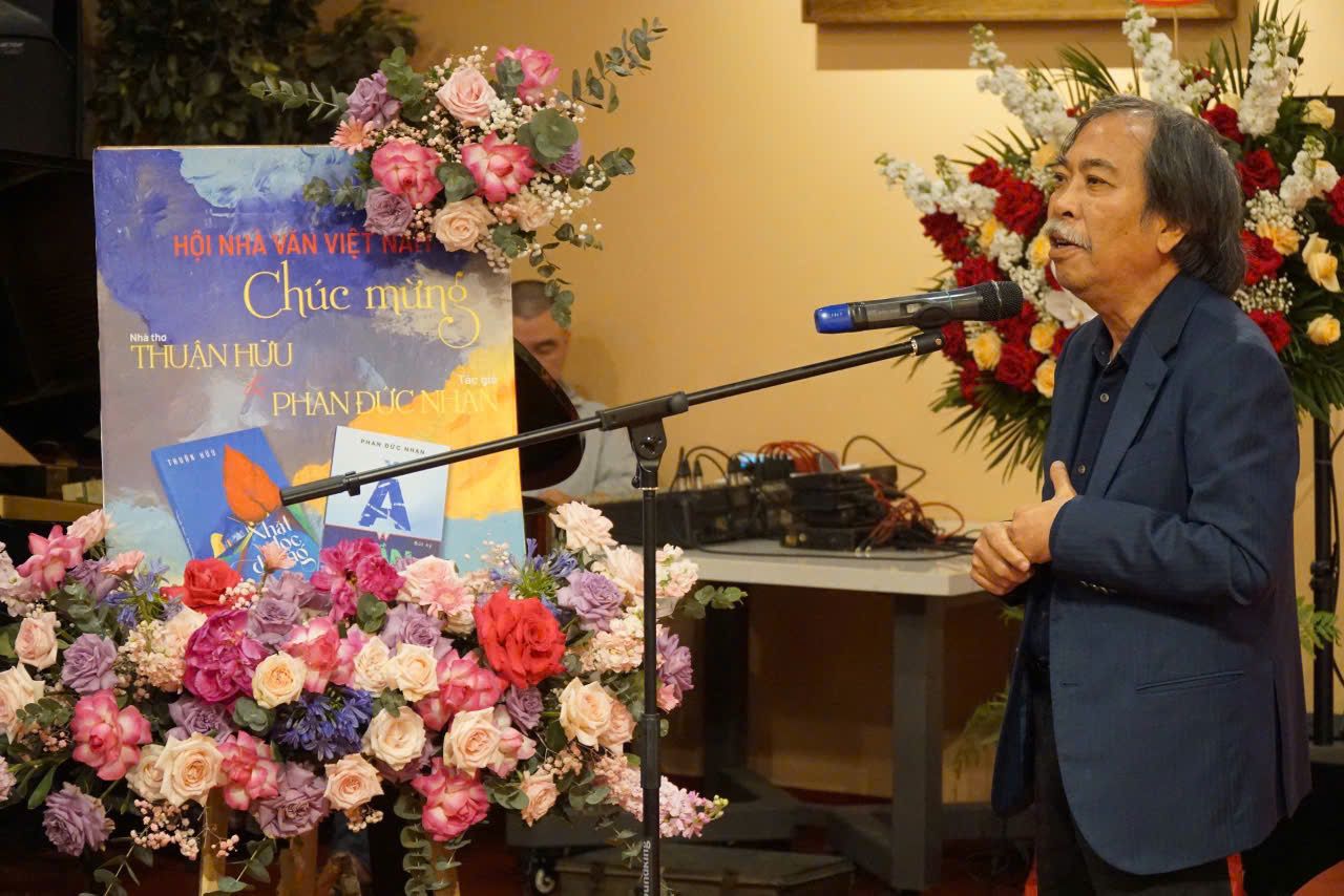Nhà thơ Thuận Hữu và nhà văn Phan Đức Nhạn (trái) cùng tổ chức lễ ra mắt sách.