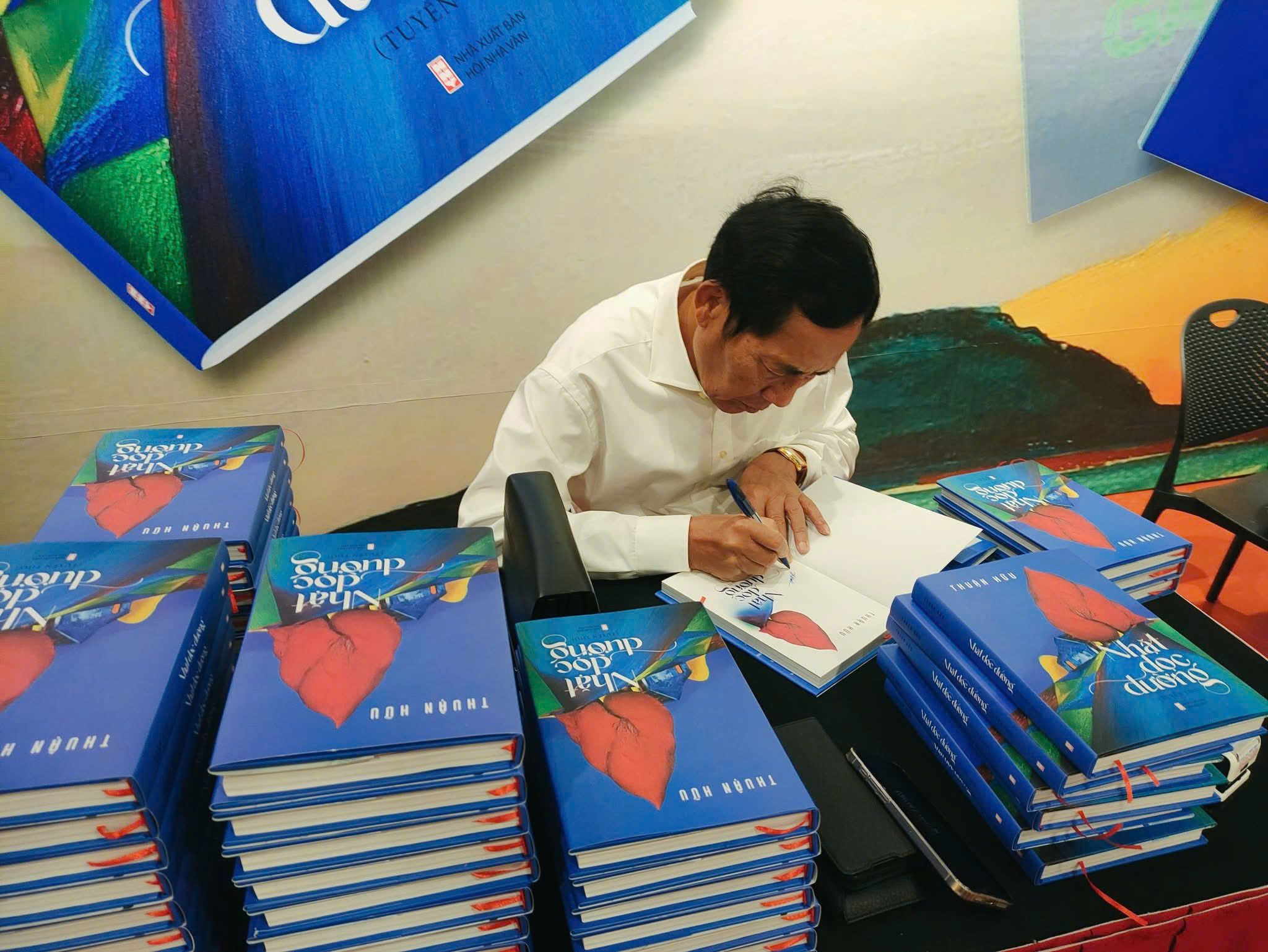 Nhà báo, nhà thơ Thuận Hữu ký tặng sách độc giả.