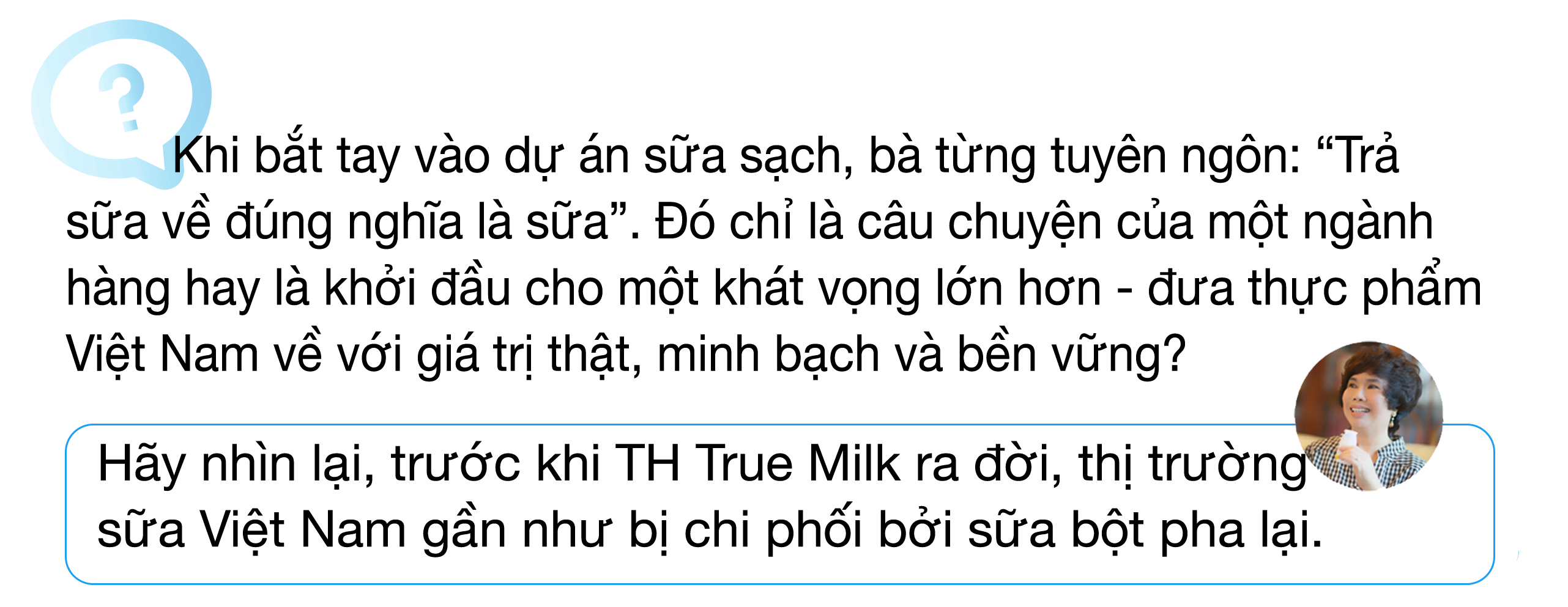 Khi tôi bắt tay vào làm sữa, tôi không chỉ muốn tạo ra một thương hiệu, mà muốn trả lại sữa đúng nghĩa là sữa - một ly sữa tươi sạch, không có dư lượng kháng sinh, không có hooc-môn tăng trưởng, không có chất bảo quản. Bởi vì đó là quyền được hưởng thực phẩm sạch của trẻ em Việt Nam.