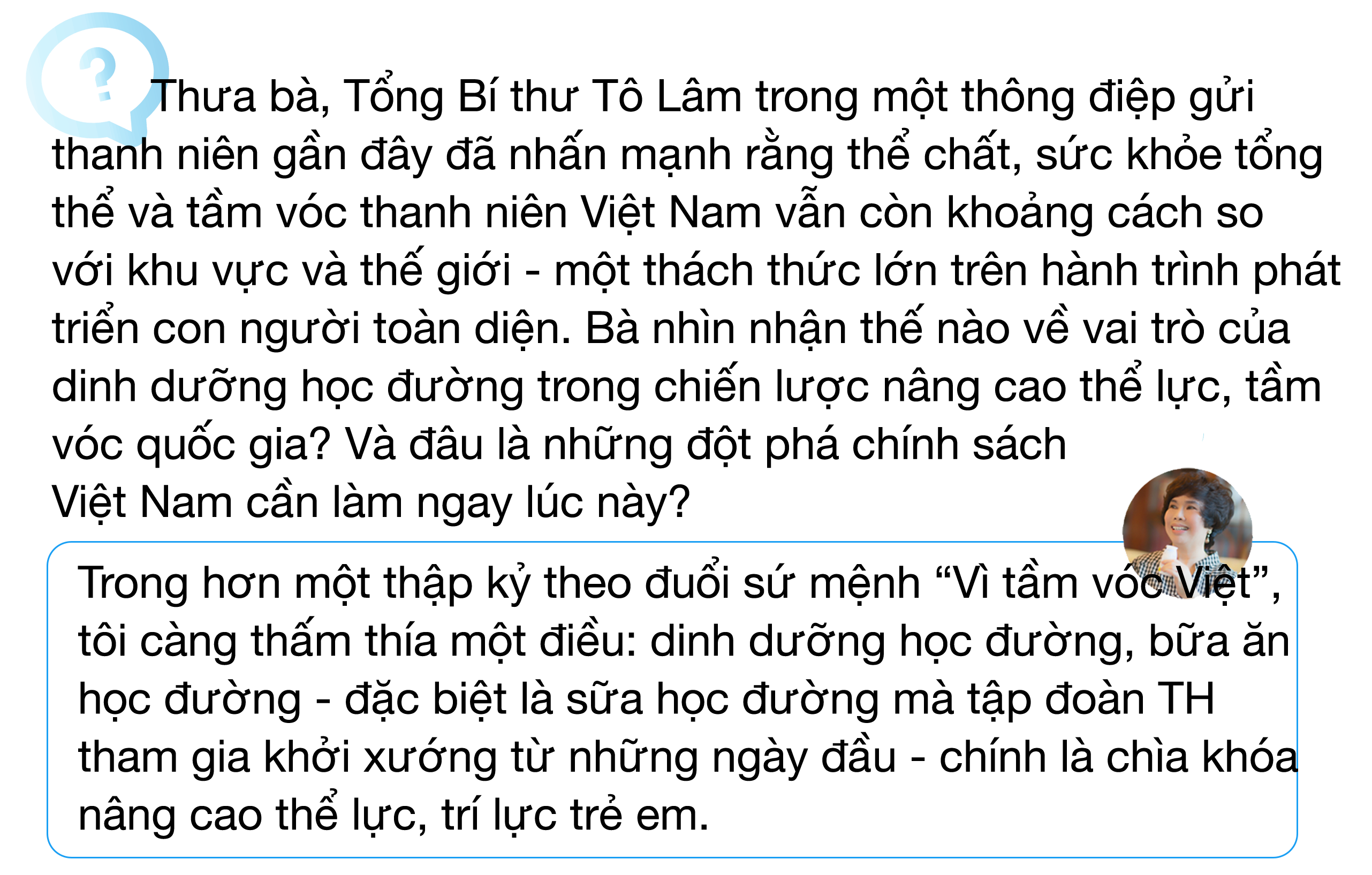 Tôi và Tập đoàn TH sẽ tiếp tục làm “người nội trợ tử tế”, đồng hành cùng Chính phủ và toàn xã hội kiến tạo nền tảng dinh dưỡng học đường bền vững. Chúng ta cần thúc đẩy, xây dựng và sớm ban hành Luật Dinh dưỡng học đường - như một trụ cột của chiến lược phát triển con người toàn diện. Chỉ khi thế hệ trẻ Việt Nam có thể chất khỏe mạnh, bản lĩnh vững vàng và phẩm hạnh anh hùng, thì dân tộc Việt mới thực sự bước vào kỷ nguyên hưng thịnh, như Tổng Bí thư đã gửi gắm trong thông điệp: “Thanh niên - thế hệ trẻ - là rường cột quyết định sự hưng thịnh của đất nước”.