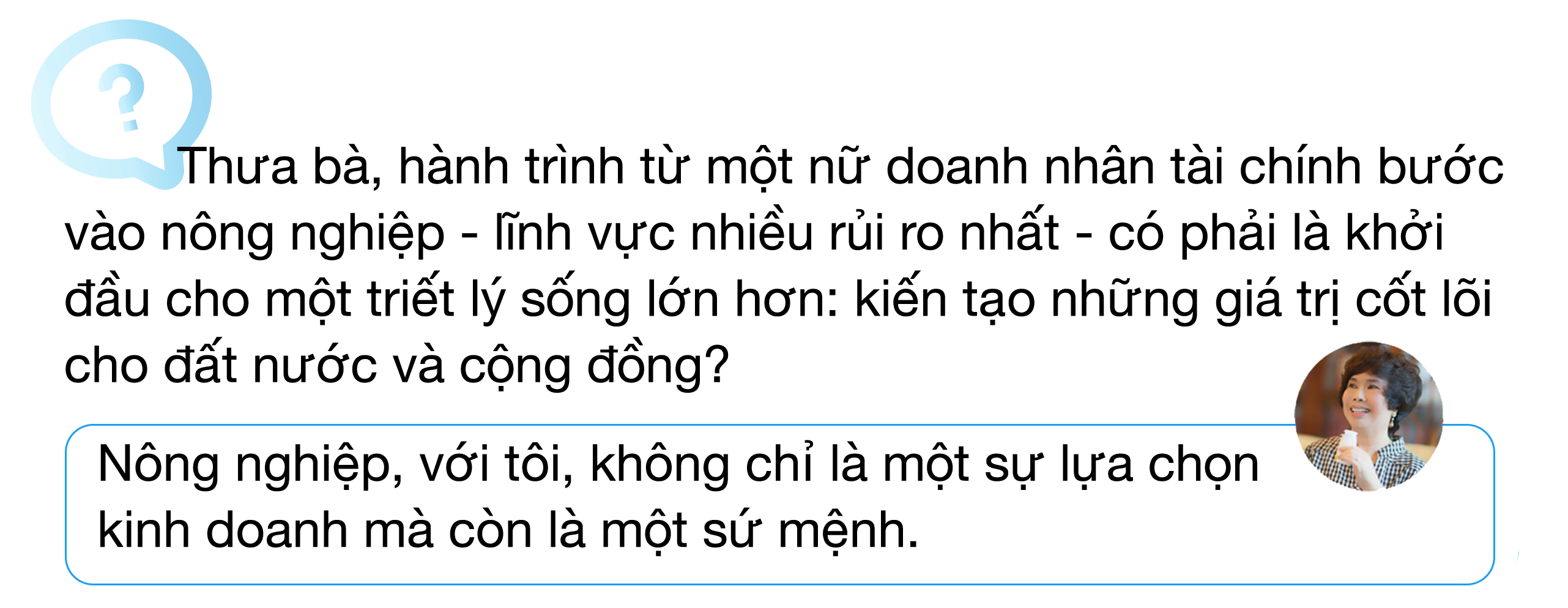 Vì vậy, tôi đã lựa chọn một con đường khác biệt, con đường ngắn nhất là ứng dụng khoa học công nghệ, khoa học quản trị vào nông nghiệp, đặt tiêu chuẩn chất lượng quốc tế lên hàng đầu, và quan trọng nhất là tạo ra những giá trị thật, từ sản phẩm sạch, an toàn cho sức khỏe con người, đến việc góp phần thay đổi tư duy làm nông nghiệp tại Việt Nam; như Tổng Bí thư Tô Lâm từng nhấn mạnh phải xác lập một phương thức sản xuất mới tiên tiến, hiện đại, thay thế cách làm manh mún, lạc hậu trước kia.
