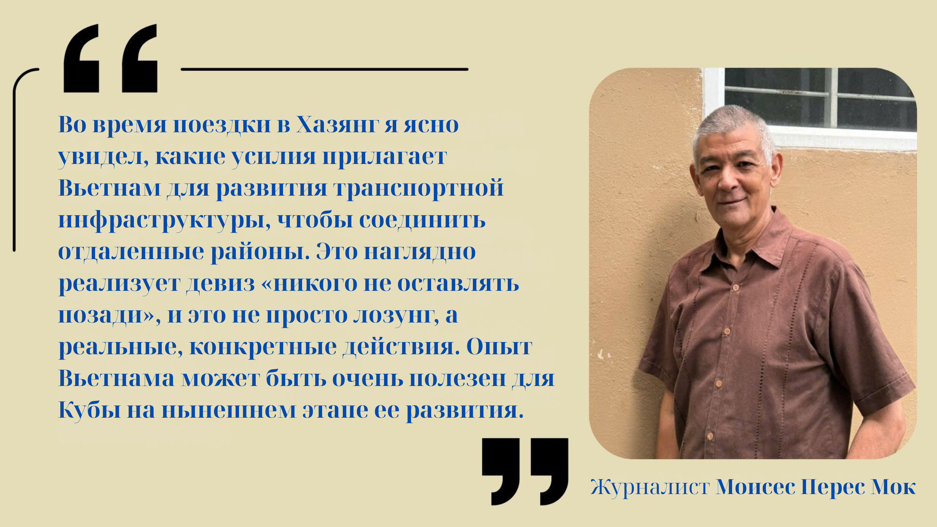 Помимо регулярного освещения политической, экономической и общественной жизни во Вьетнаме, журналист Моисес активно путешествует по стране, чтобы получить реальные впечатления о происходящем. Во время рабочей поездки в провинцию Хазянг, организованной Департаментом прессы Министерства иностранных дел Вьетнама, он имел возможность ближе познакомиться с жизнью национальных меньшинств в этом регионе. «Во время поездки в Хазянг я ясно увидел, какие усилия прилагает Вьетнам для развития транспортной инфраструктуры, чтобы соединить отдаленные районы. Это наглядно реализует девиз «никого не оставлять позади», и это не просто лозунг, а реальные, конкретные действия», — отметил он, добавив, что опыт Вьетнама может быть очень полезен для Кубы на нынешнем этапе ее развития.