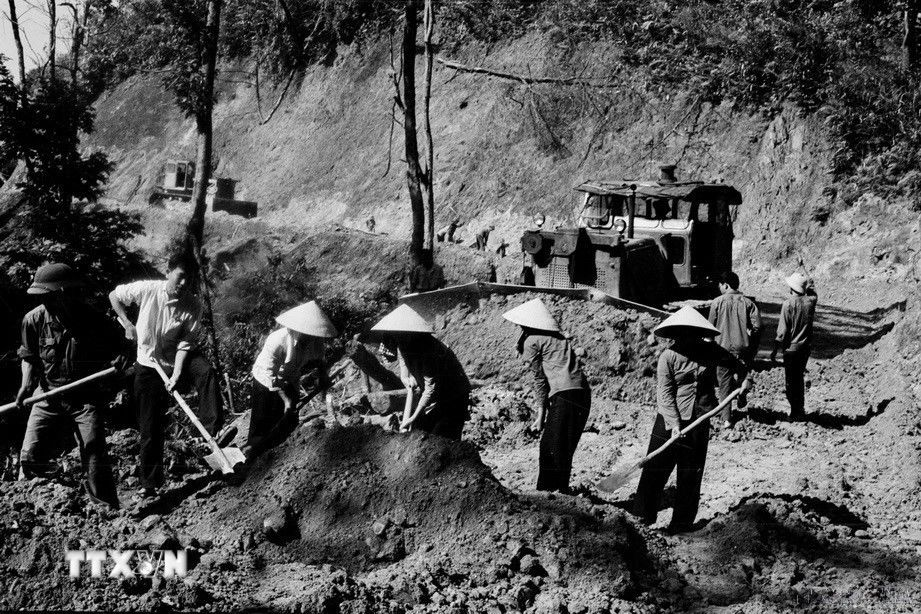 Cán bộ, nhân dân và lực lượng giao thông Trị - Thiên mở đường mới phục vụ chiến dịch. Ảnh: Đỗ Tráng/TTXVN.
