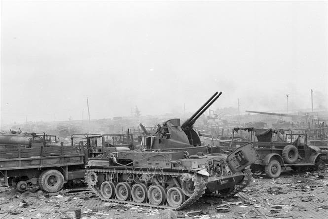Xe thiết giáp cùng nhiều khí tài chiến đấu của địch bỏ lại bữa bãi ở Huế trong lúc tháo chạy. Ảnh tư liệu TTXVN.