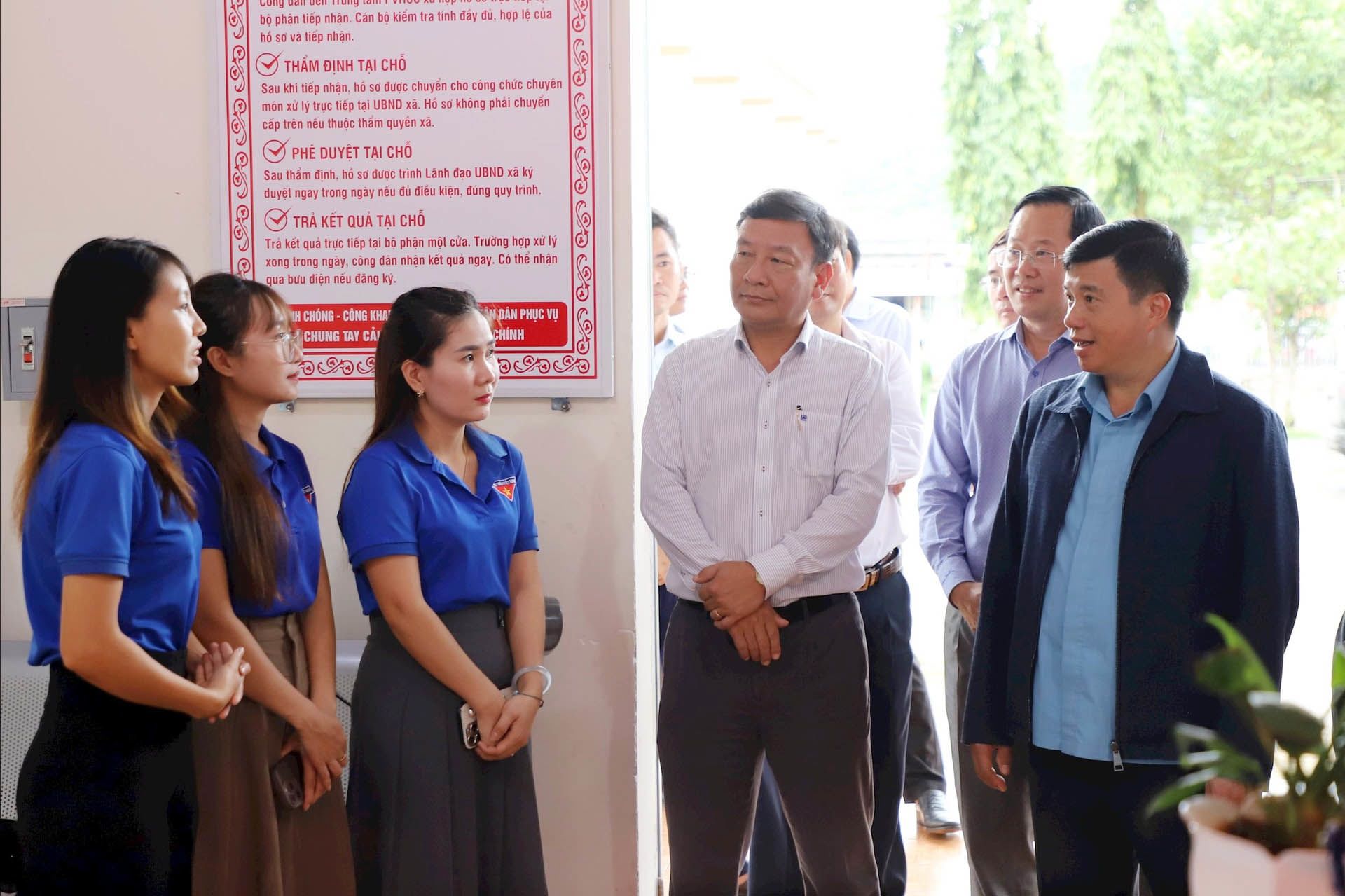 Chủ tịch Ủy ban nhân dân tỉnh Lâm Đồng Hồ Văn Mười thăm hỏi người dân đến giải quyết hồ sơ tại Trung tâm Phục vụ hành chính công xã Nhân Cơ. Ảnh: Mai Văn Bảo.