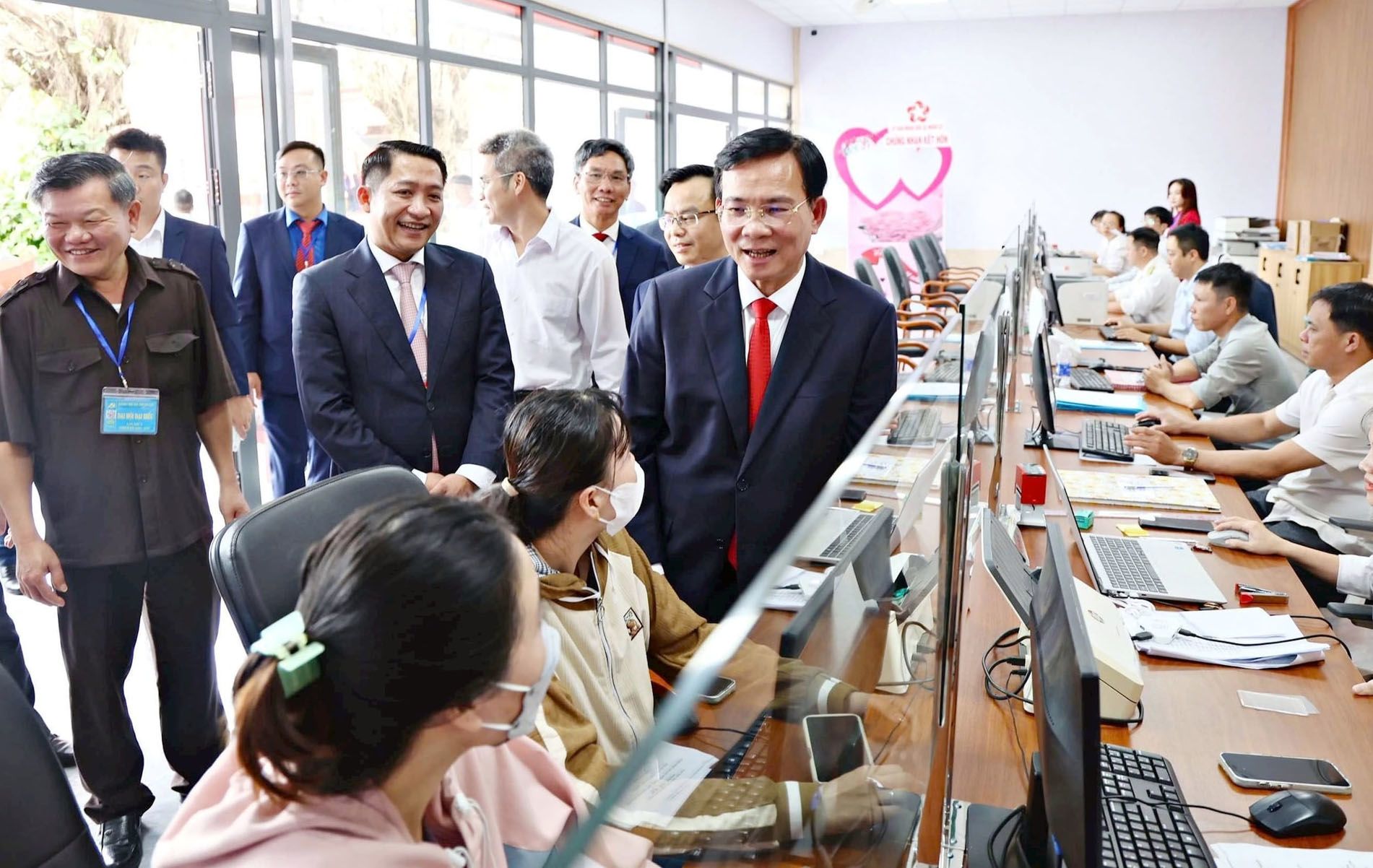 Đồng chí Lê Ngọc Châu (thứ hai từ phải sang), Chủ tịch UBND thành phố Hải Phòng kiểm tra việc vận hành Trung tâm phục vụ hành chính công phường Thành Đông, thành phố Hải Phòng. Ảnh: Xuân Trường.