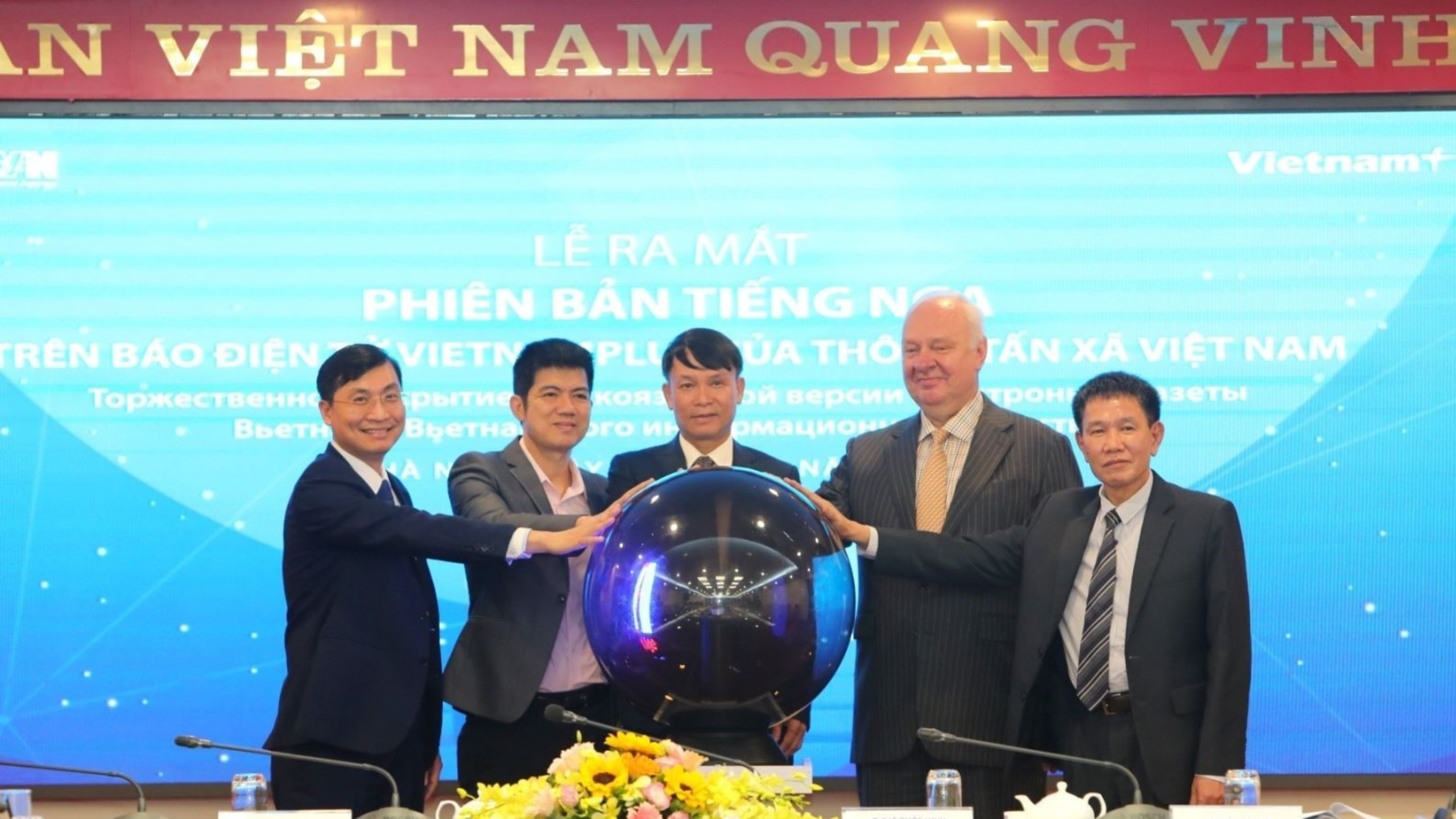 Tổng giám đốc Nguyễn Đức Lợi, Đại sứ Konstantin V.Vnukov và các đại biểu thực hiện nghi thức ra mắt phiên bản tiếng Nga trên báo điện tử VietnamPlus của TTXVN, ngày 3/3/2020. Ảnh: TTXVN.
