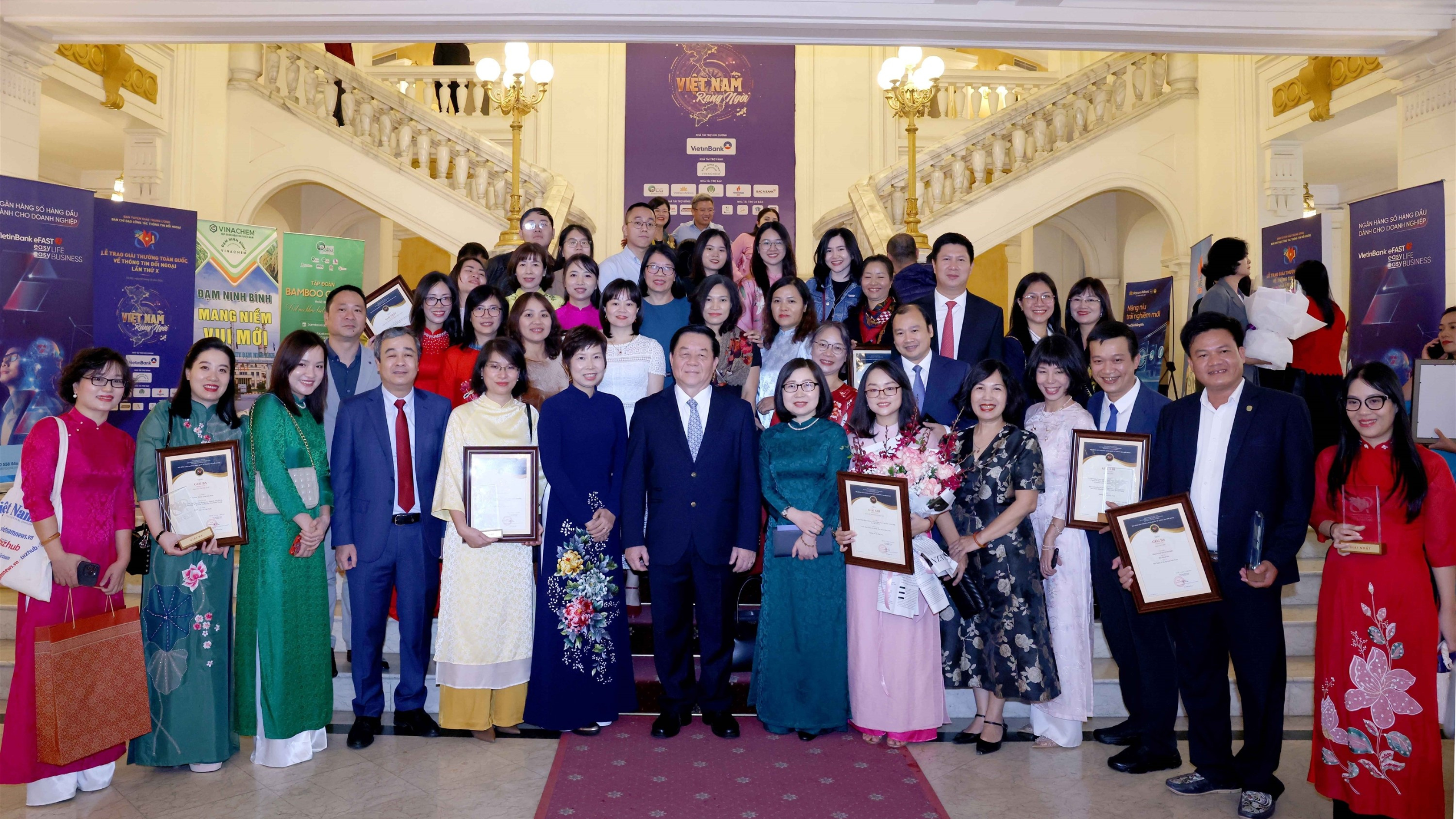 Trưởng ban Tuyên giáo Trung ương Nguyễn Trọng Nghĩa, Tổng giám đốc TTXVN Vũ Việt Trang, Phó tổng giám đốc TTXVN Đoàn Thị Tuyết Nhung và các tác giả, nhóm tác giả của TTXVN tại lễ trao Giải thưởng toàn quốc về thông tin đối ngoại lần thứ X, tối 3/12/2024.