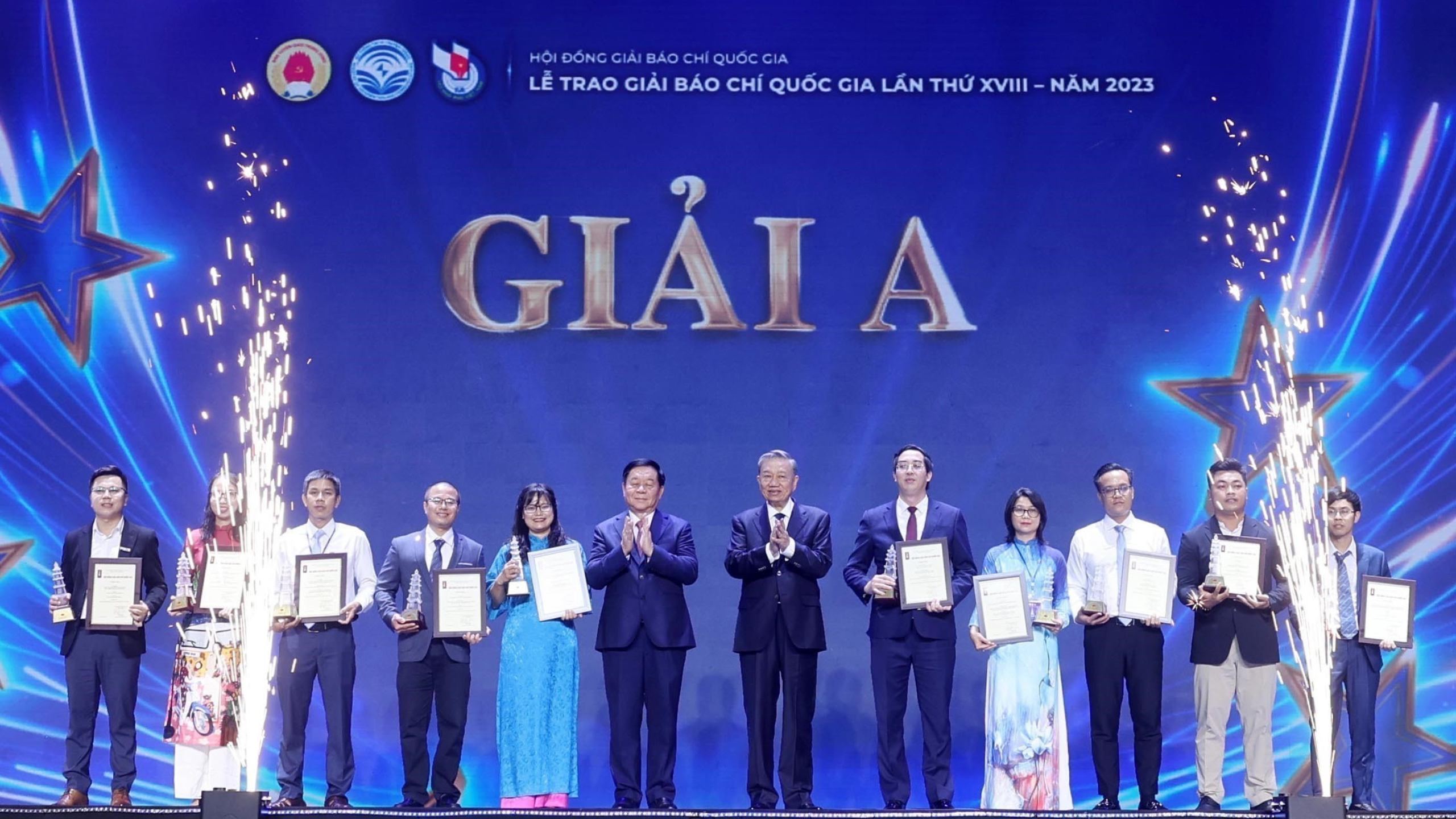 Chủ tịch nước Tô Lâm và Trưởng ban Tuyên giáo Trung ương Nguyễn Trọng Nghĩa trao giải A Giải báo chí quốc gia năm 2023 cho các tác giả, đại diện nhóm tác giả, ngày 21/6/2024.