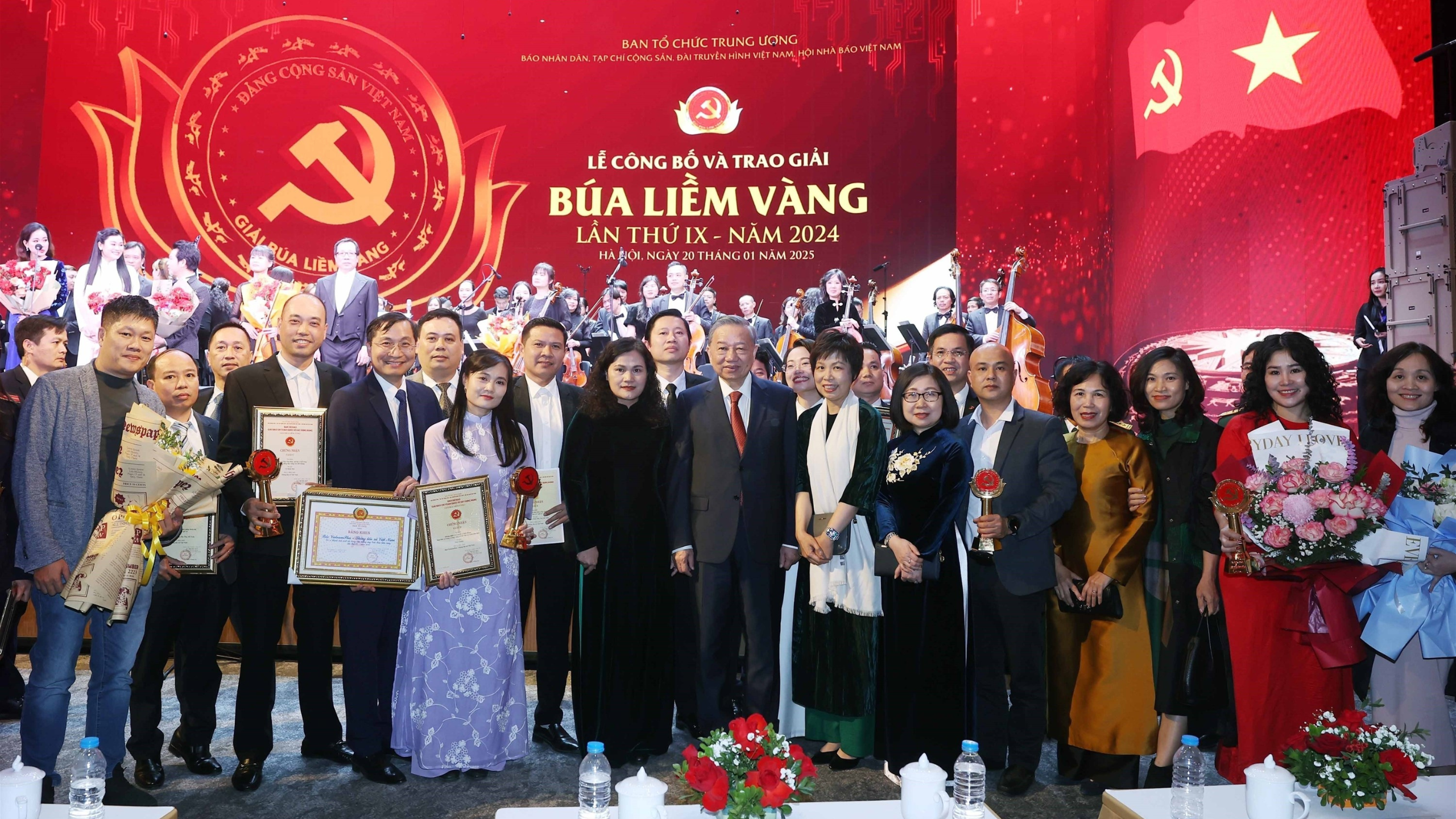Tổng Bí thư Tô Lâm, Tổng giám đốc TTXVN Vũ Việt Trang, các Phó tổng giám đốc TTXVN Đoàn Thị Tuyết Nhung và Nguyễn Thị Sự cùng các tác giả của TTXVN được trao Giải Búa liềm Vàng lần thứ IX, ngày 20/1.