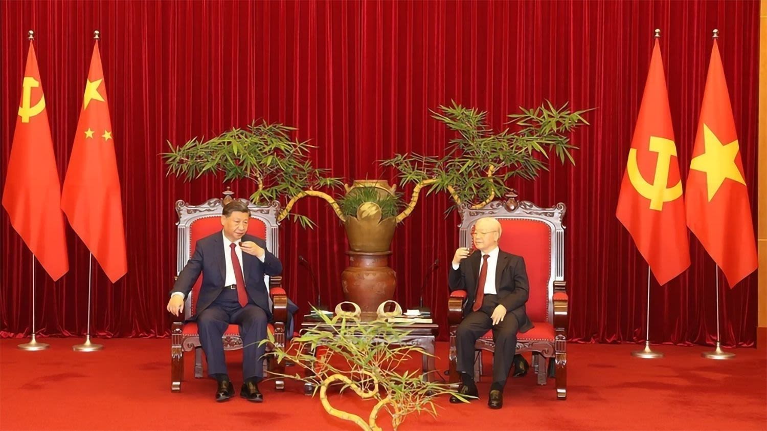 Tổng Bí thư Nguyễn Phú Trọng thân mật mời Tổng Bí thư, Chủ tịch Trung Quốc Tập Cận Bình dự Tiệc trà, ngày 12/12/2023. (Ảnh: TTXVN)