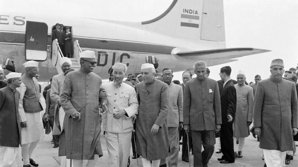 Tổng thống Prasat và Thủ tướng Jawaharlal Nehru ra sân bay New Delhi đón Chủ tịch Hồ Chí Minh thăm hữu nghị Ấn Độ từ ngày 5 đến 14/2/1958. (Ảnh: Tư liệu TTXVN)