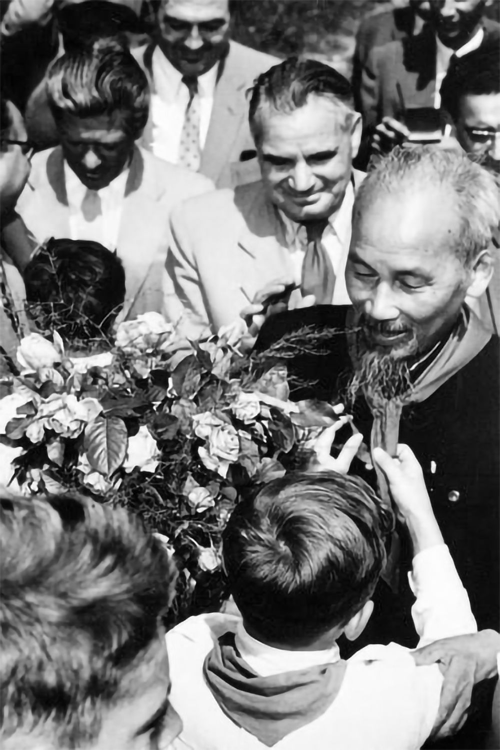 Thiếu nhi Hungary tặng hoa Chủ tịch Hồ Chí Minh khi Người đến thăm trại hè của thiếu nhi thủ đô Budapest, ngày 4/8/1957. (Ảnh: TTXVN)