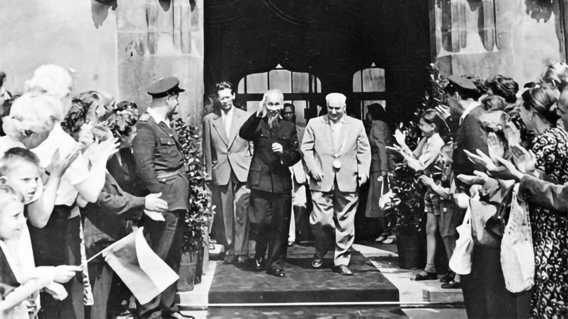 Chủ tịch Hồ Chí Minh đến thăm Tòa thị chính Praha trong chuyến thăm hữu nghị Tiệp Khắc, ngày 18/7/1957. (Ảnh: TTXVN)