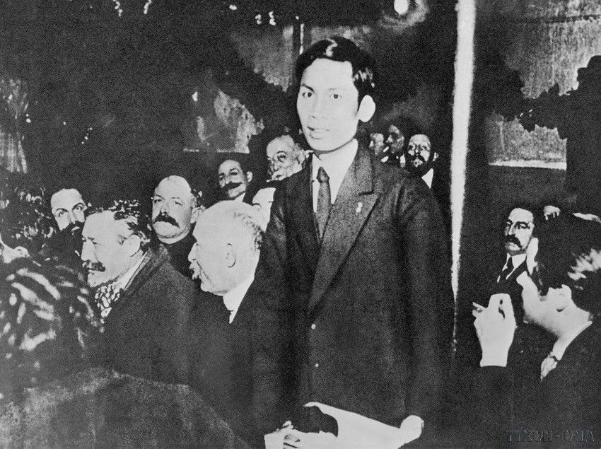 Đồng chí Nguyễn Ái Quốc phát biểu tại Đại hội thành lập Đảng Cộng sản Pháp họp ở thành phố Tours. Đồng chí là người Việt Nam đầu tiên trở thành người cộng sản và là một trong những sang lập viên của Đảng Cộng sản Pháp (tháng 12/1920). (Ảnh: TTXVN)