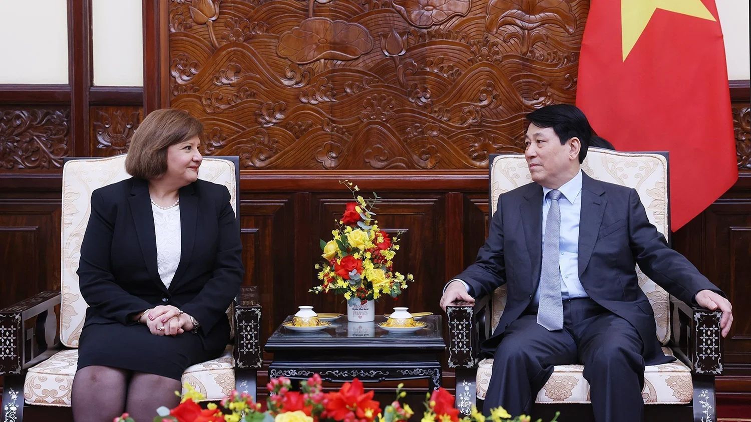 Президент Вьетнама Лыонг Кыонг принимает посла Египта во Вьетнаме Амаль Абдель Кадер Эльморси Саламу, прибывшую с прощальным визитом в связи с завершением ее срока работы, 1 июля 2025 года. Фото: ВИА
