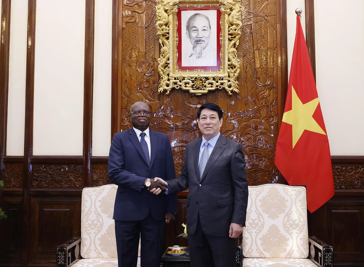 Президент Вьетнама Лыонг Кыонг принимает посла Анголы Фернандо Мигеля, прибывшего в Ханой для вручения верительных грамот и начала своей дипломатической миссии во Вьетнаме, 24 апреля 2025 года. Фото: ВИА