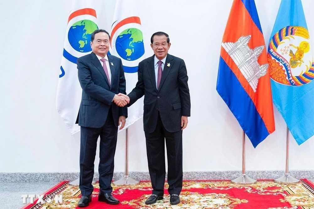 柬埔寨人民党主席、柬埔寨参议院议长洪森欢迎国会主席陈青敏出席IPTP 11。(图片来源:越通社)