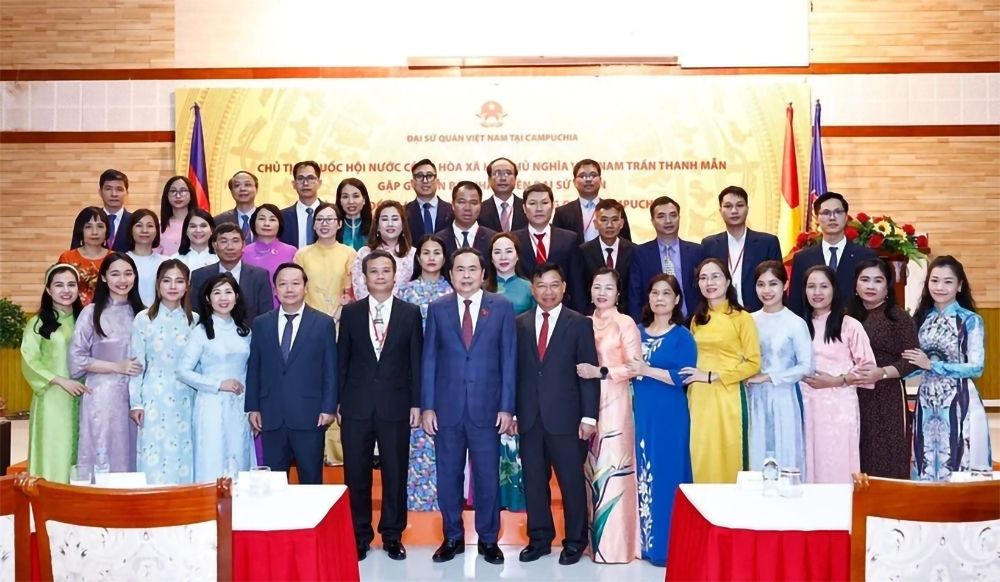 越南国会主席陈青敏率越南党和国家高级代表团与越南驻柬埔寨大使馆干部和工作人员以及旅柬越南人社区代表会面。(图片来源:越通社)