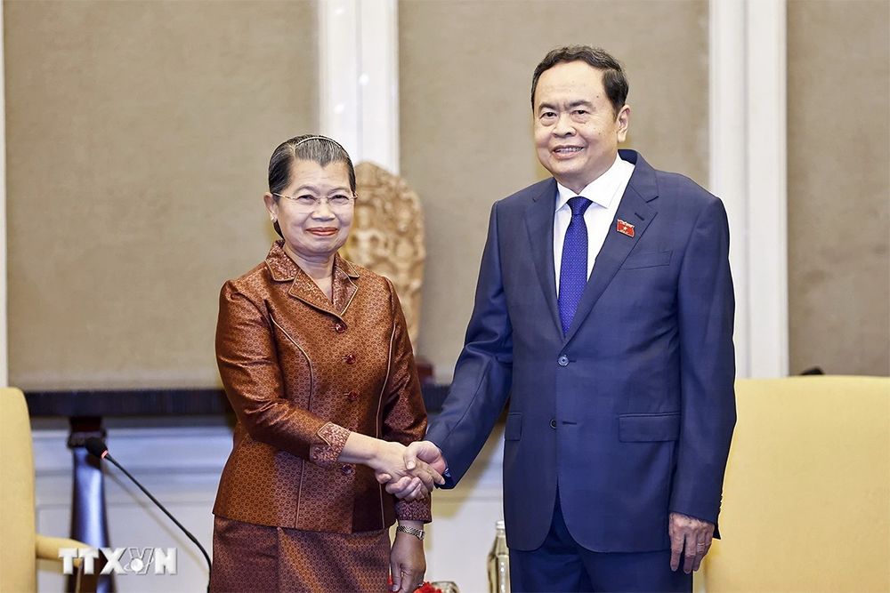 越南国会主席陈青敏会见柬埔寨国王最高顾问委员会成员、柬越友好议员小组主席、柬越友好协会主席梅森安。(图片来源:越通社)